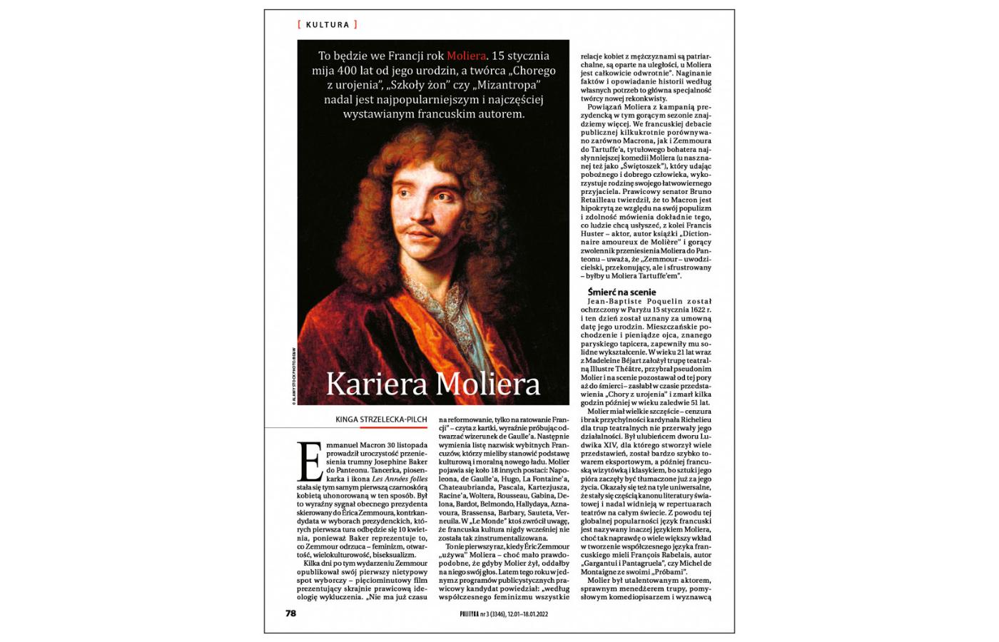 Z zainteresowaniem i przyjemnością przeczytałem artykuł „Kariera Moliera” (POLITYKA 3). Tekst pióra p. Kingi Strzeleckiej-Pilch jest dla mnie w tym momencie również okazją do złożenia ukłonów i wyrazów szacunku Autorce. A dlaczego piszę? Rozbawiło mnie przytoczone w tekście różne spojrzenie dwóch tłumaczy „Szkoły żon” na ocenę, powiedzmy, kondycji męskiej Arnolfa. Boy-Żeleński chyba nie przeoczył podanego przez Moliera wieku jego bohatera, tj. 42 lat. Czy to już „starzec” według notabene lekarza Boya-Żeleńskiego? Tak widać ocenił jego poziom testosteronu i inne męskie przewagi siedemnastowieczne.