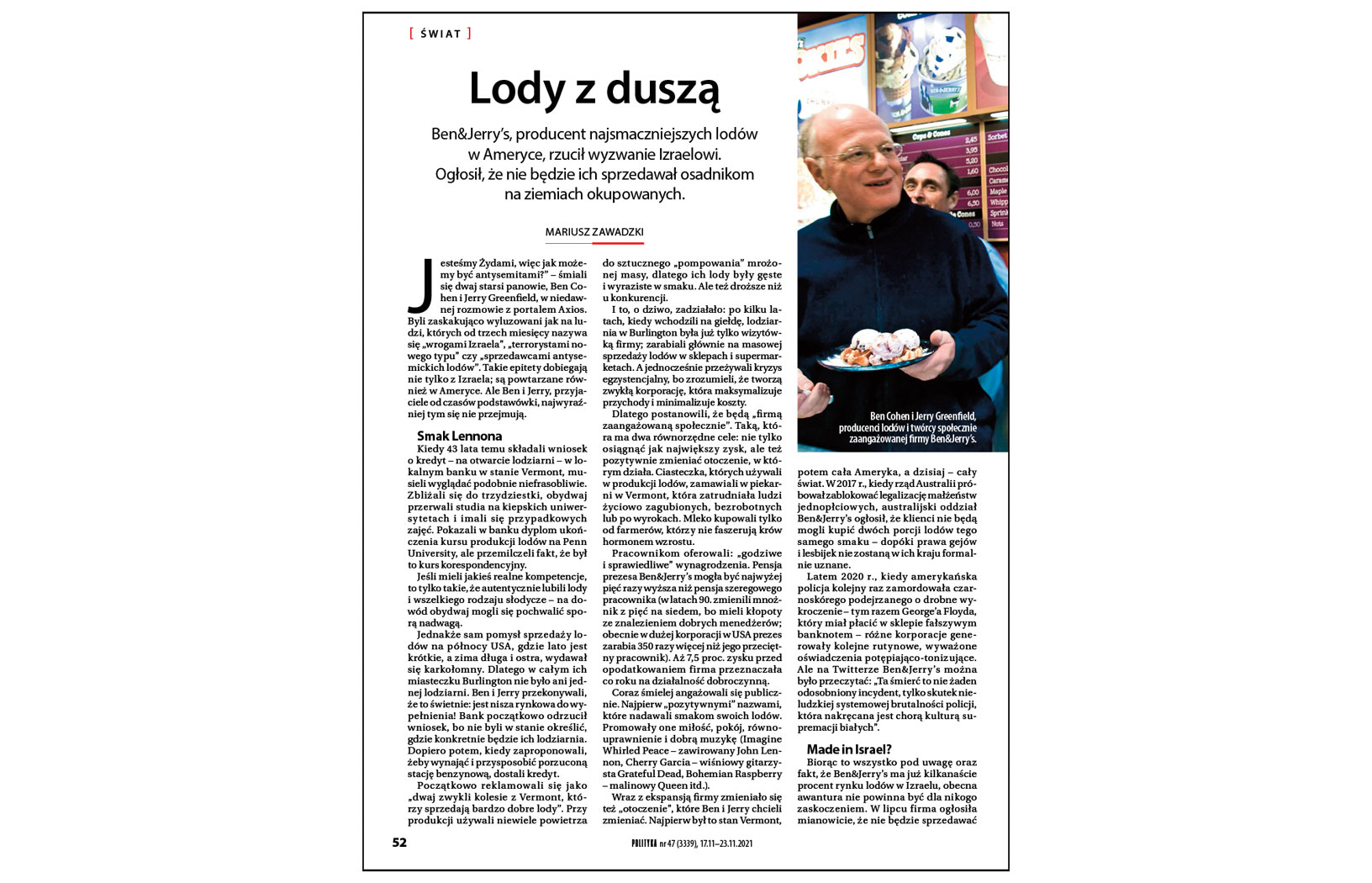 Nawiązując do artykułu „Lody z Duszą” (POLITYKA 47/21), warto przypomnieć, że historia lodów Ben&Jerry’s ma jeden zapomniany rozdział, który mocno utrwalił się w pamięci polskich dyplomatów zabiegających w USA w latach dziewięćdziesiątych ubiegłego wieku o członkostwo Polski w NATO. W 1998 r., w samym szczycie kampanii na rzecz poszerzenia, na tydzień przed historycznym głosowaniem w Senacie USA powstała koalicja zrzeszająca producenta płyt Rhino Records, zabawek Hasbro Inc. oraz lodów Ben&Jerry’s Ice Cream. Koalicja, wspierana przez ultrakonserwatywny CATO Institute – z aktywnym udziałem Susan Eisenhower (wnuczki prezydenta USA) – uruchomiła kampanię na rzecz powstrzymania procesu poszerzenia. Główne argumenty: poszerzenie będzie kosztowało amerykańskiego podatnika krocie, NATO utraci „sterowność strategiczną”, doprowadzi do izolacji Rosji i przywróci mentalność zimnowojenną po obu stronach podziału.
