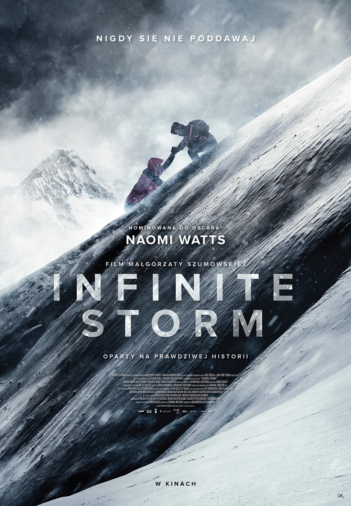 Jej bohaterka, Pam Bales, wyrusza na samotną wędrówkę na Górę Waszyngtona, najwyższe wzniesienie nieprzewidywalnych, targanych lodowatymi wichurami Gór Białych w amerykańskim stanie New Hampshire. Ta wyprawa to jej rytuał i sposób na poradzenie sobie z dramatycznymi wspomnieniami. I właśnie w dniu, w którym czuje się najsłabsza, będzie musiała wykazać się największą siłą: ktoś umrze, jeśli nie udzieli mu pomocy. Ale jeśli zdecyduje się pomóc, sama też może zginąć. „Infinite Storm” wciąga nas w sam środek monumentalnego pejzażu, szalejących żywiołów i ekstremalnych emocji. Przypomina, że piękno i groza bywają nierozłączne, a życiowe kryzysy są nieuniknione, tak jak gwałtowne załamania pogody. Poruszająca historia Pam Bales uczy, że warto stawiać im czoła i nigdy się nie poddawać.