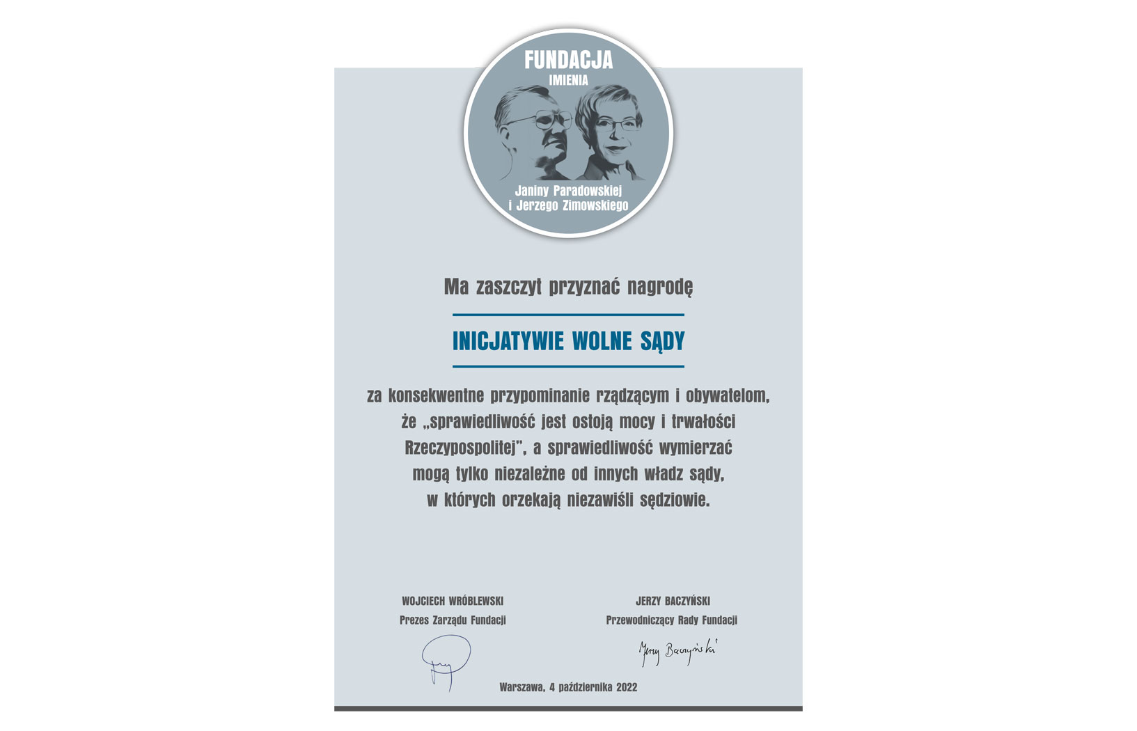 Dla Janiny Paradowskiej to było najważniejsze wydarzenie w roku. Od 2008 r. ku pamięci Jej męża Jerzego Zimowskiego – zmarłego w 2007 r. prawnika, działacza Solidarności, byłego wiceministra spraw wewnętrznych, erudyty i państwowca – przyznawano nagrodę jego imienia. Kiedy i Ona odeszła, przedwcześnie i nagle latem 2016 r., Jej przyjaciele i bliscy postanowili kontynuować tradycję wręczania nagrody za dzielność obywatelską – a w szczególności za odwagę w działaniach na rzecz dobra publicznego, praw obywatelskich i praw człowieka. Od 2017 r. nazwa Nagrody upamiętnia również Janinę Paradowską, naszą drogą koleżankę, wieloletnią dziennikarkę i publicystkę POLITYKI. Nagrodę przyznaje Fundacja im. Janiny Paradowskiej i Jerzego Zimowskiego, powołana przez grupę przyjaciół obojga Małżonków, którzy chcą promować wartości, jakie im przyświecały: przyzwoitość, odpowiedzialność, odwagę obywatelską, wrażliwość na losy innych, a także wierność swoim przekonaniom.