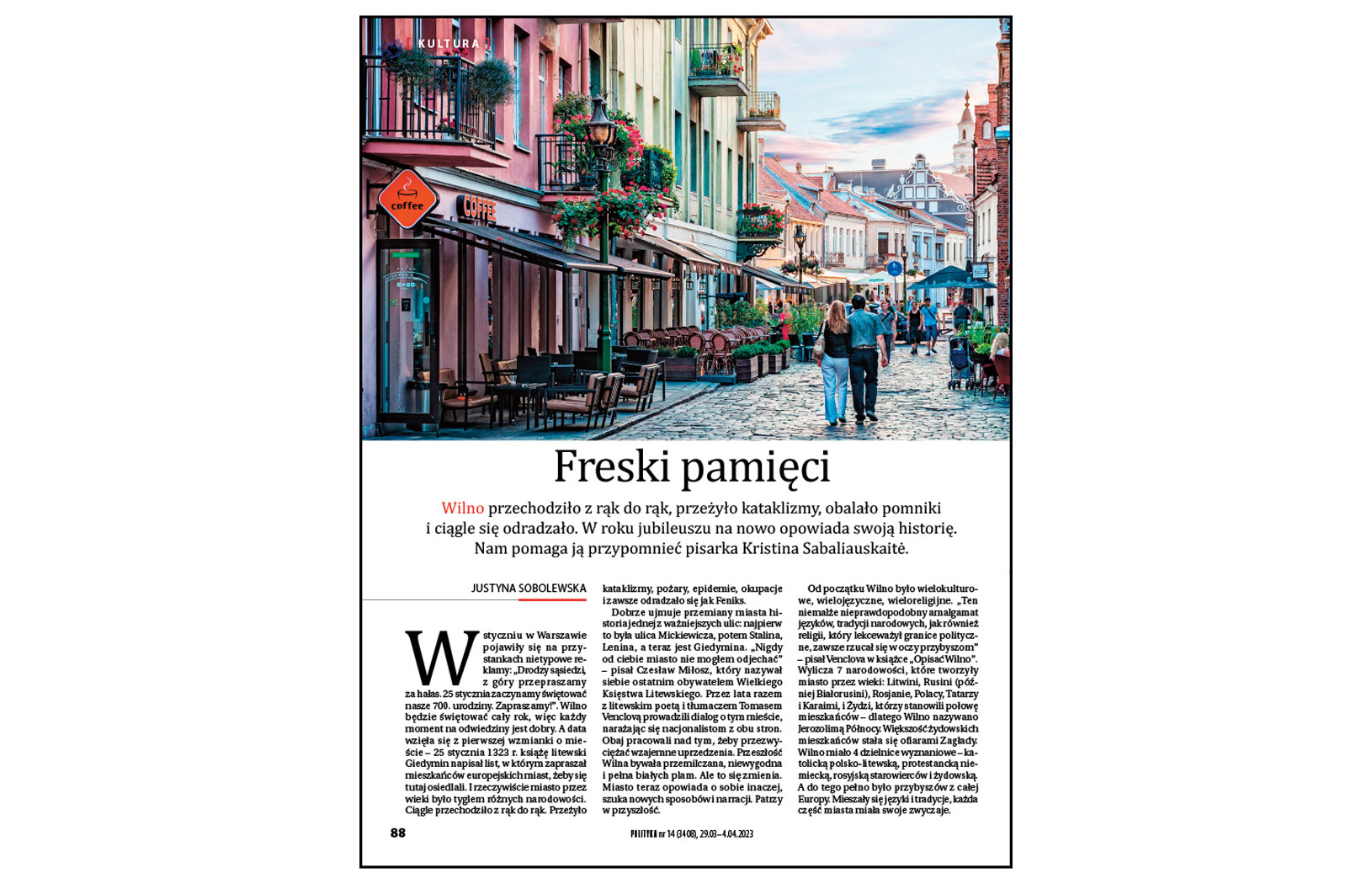 W numerze 14. POLITYKI na s. 88 zostało zamieszczone zdjęcie przedstawiające ulicę Wileńską w Kownie. Tymczasem fotografia ilustrująca artykuł „Freski pamięci” powinna przedstawiać Wilno. Oba te miasta, Kowno i Wilno, są piękne, pomyłka zaś wynikała z nieprecyzyjnego opisu agencyjnego. Panią Kristinę Sabaliauskaitė oraz Czytelników przepraszamy.
