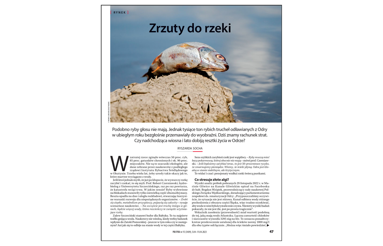 Smutny jest wydźwięk artykułu Ryszardy Sochy o niebezpieczeństwie powtórki ekologicznej katastrofy na Odrze z powodu trwającego wciąż odprowadzania do niej zasolonych wód kopalnianych („Zrzuty do rzeki”, POLITYKA 15). Konsultowani przez autorkę eksperci w zasadzie nie widzą możliwości rozwiązania problemu, bo przemysłowe odsalanie takiej ilości ścieków byłoby horrendalnie drogie, a zamknięcia naszych kopalń miedzi nikt sobie raczej nie wyobraża. Ba, również kopalnie węgla położone w zlewni Odry mają przed sobą jeszcze przynajmniej kilka dziesiątków lat funkcjonowania, gdyż w większości produkują węgiel koksujący – a koks jest niezbędny do wytopu stali – na który nawet Unia Europejska patrzy łaskawym okiem.
