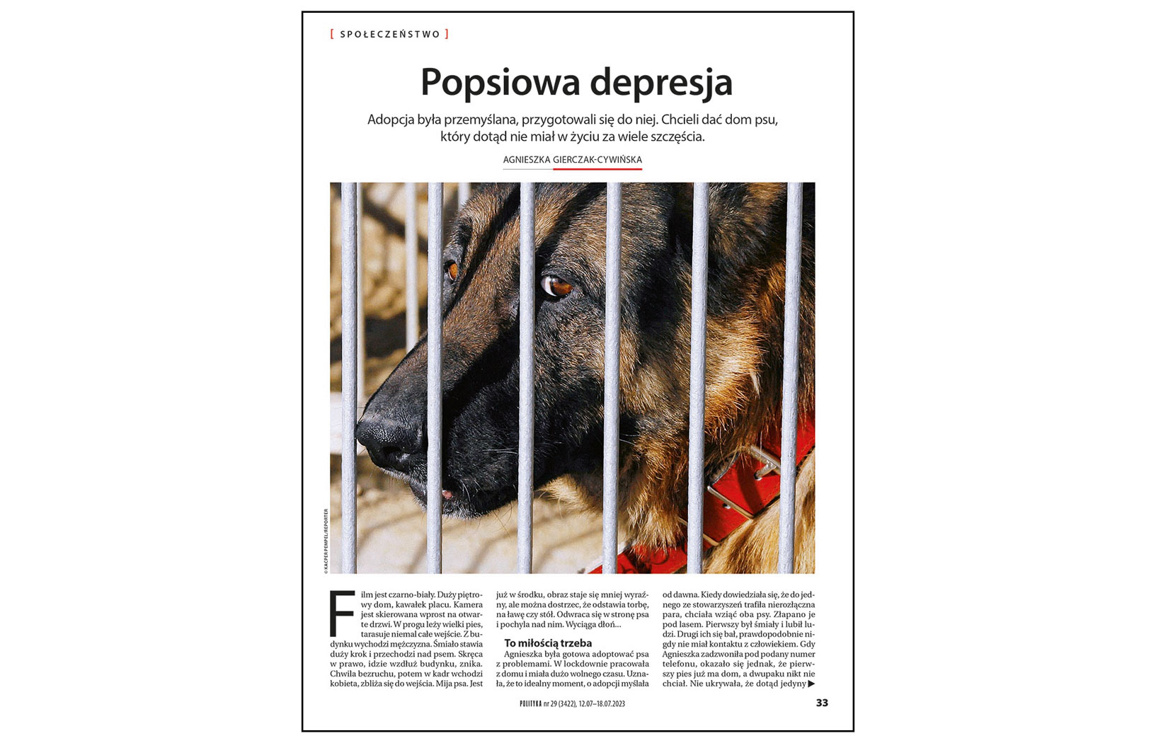 Przeczytałam artykuł „Popsiowa depresja” (POLITYKA 29) i przyznaję, że jestem wstrząśnięta. Wiele metod zalecanych przez wspomnianych w tekście „behawiorystów” zostało zdyskredytowanych dwie dekady temu. We wszystkich opisanych przypadkach można było postąpić lepiej i uniknąć podstawowych błędów. Gdy pies boi się człowieka, zachowujemy dystans i uczymy się podstaw psiej komunikacji. Już w latach 70. Monty Roberts mówił, jak zyskać zaufanie zwierzęcia: powoli podchodzimy, a na sygnał stresu, natychmiast się wycofujemy. Zwierzę widzi, że jest rozumiane, a człowiek stosuje się do jego próśb. To tak budujemy zaufanie.