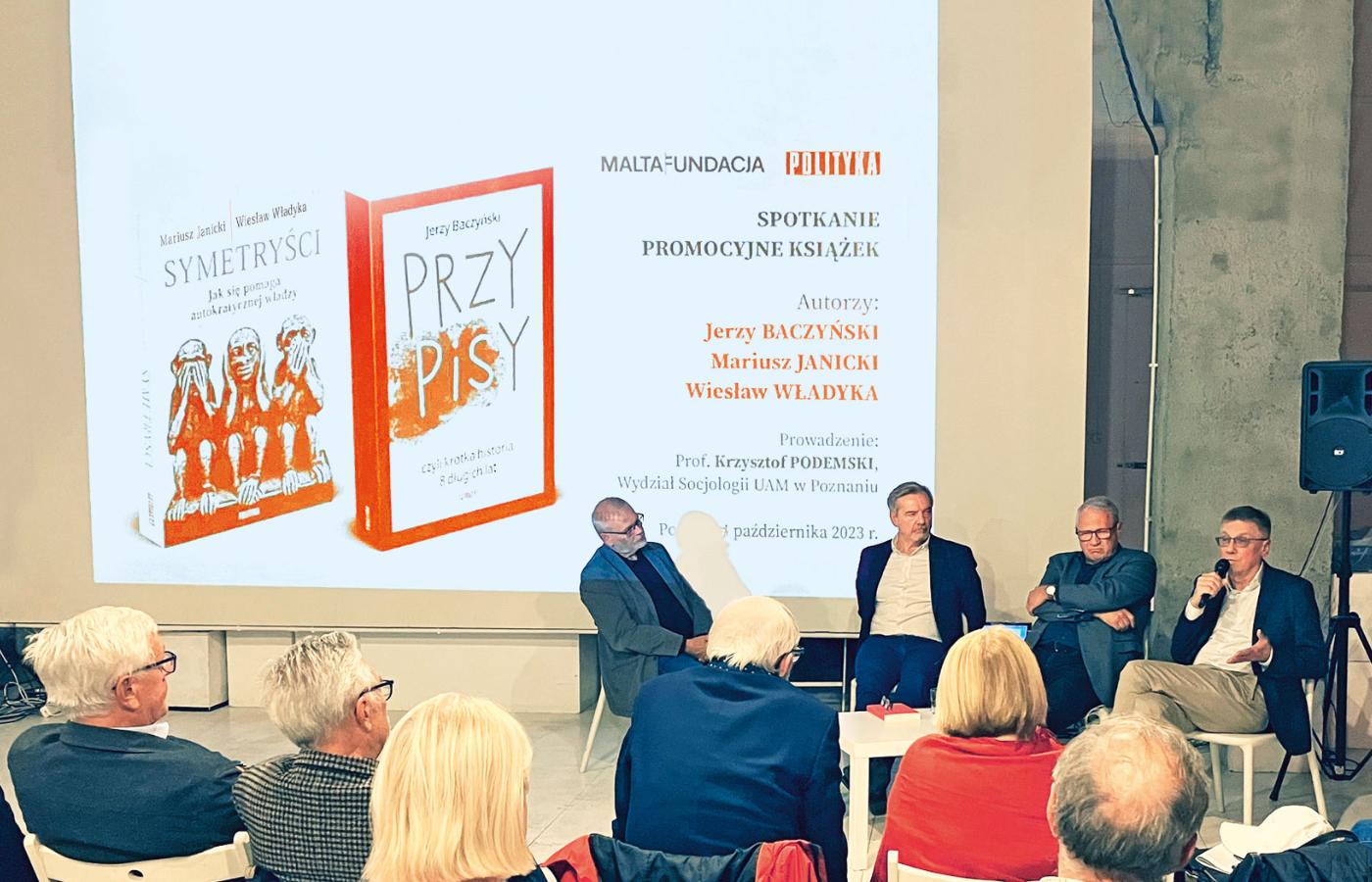 W minioną środę odbyło się kolejne z cyklu spotkań z autorami POLITYKI: redaktorem naczelnym naszego tygodnika Jerzym Baczyńskim, jego pierwszym zastępcą Mariuszem Janickim oraz naszym publicystą prof. Wiesławem Władyką. Tym razem w Poznaniu, w siedzibie Fundacji Malta, wśród licznie przybyłych gości, nasi publicyści wraz z prof. Krzysztofem Podemskim z Wydziału Socjologii Uniwersytetu im. Adama Mickiewicza rozmawiali nie tylko o swoich książkach, ale i zbliżających się wyborach, towarzyszącej im kampanii oraz politycznych scenariuszach na najbliższe tygodnie.