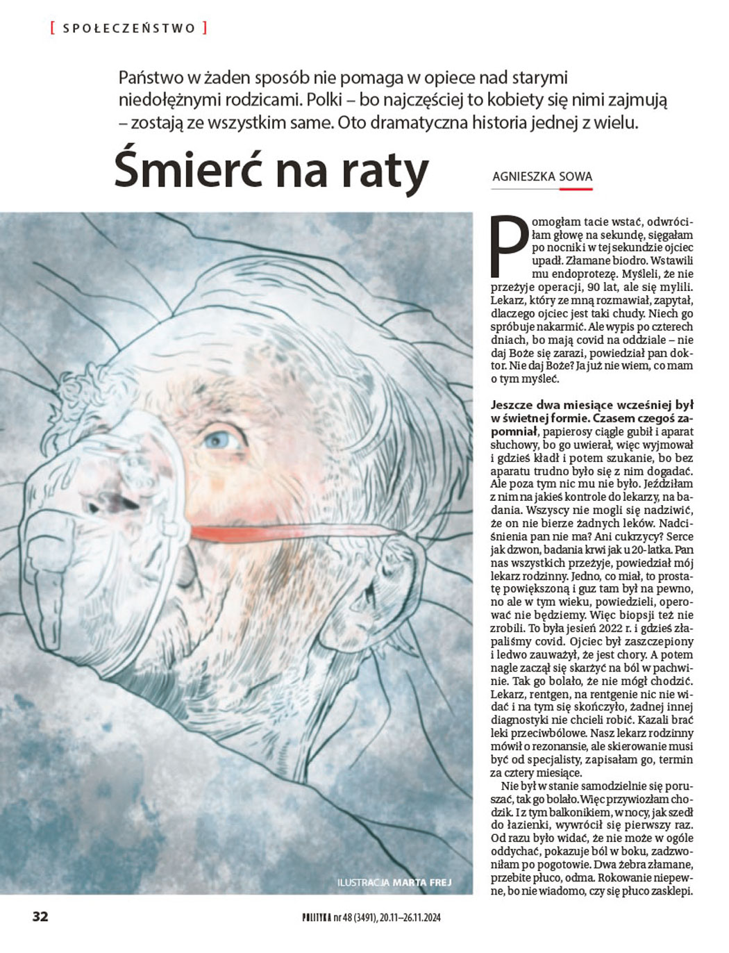 Bardzo dziękujemy za tę i inne poruszające relacje, a także za słowa wsparcia spływające do nas po publikacji wspomnianego reportażu Agnieszki Sowy, który zainicjował akcję „Odchodzić po ludzku” (polecamy też rozmowę Pawła Walewskiego z ministrą ds. polityki senioralnej Marzeną Okłą-Drewnowicz – s. 32, oraz kolejne materiały, które w tym cyklu będą się pojawiać na naszych łamach). Więcej informacji o naszej inicjatywie oraz wszelkie aktualne i archiwalne materiały związane z tematem są dostępne na naszej stronie internetowej: polityka.pl/odchodzicpoludzku.
