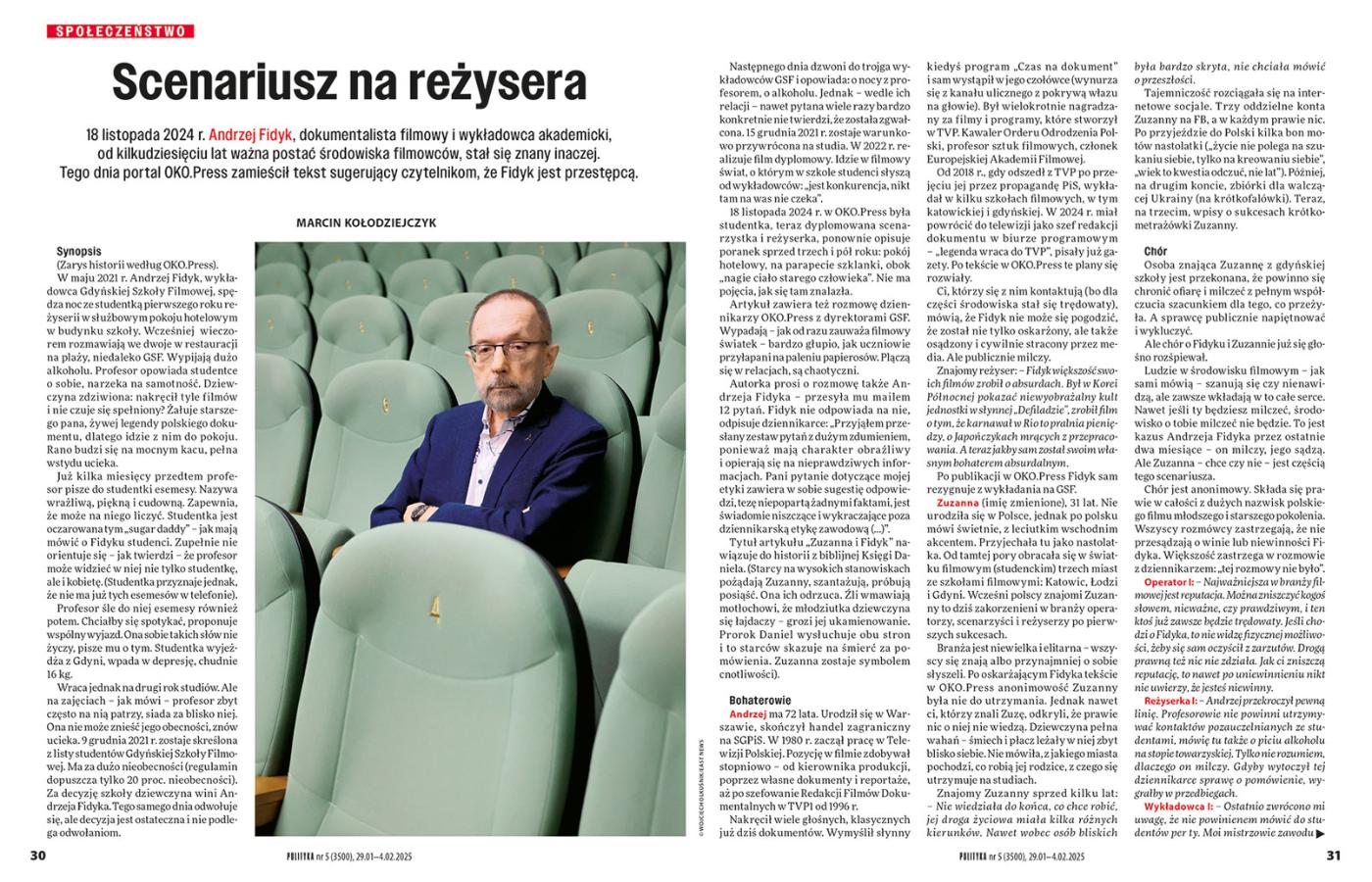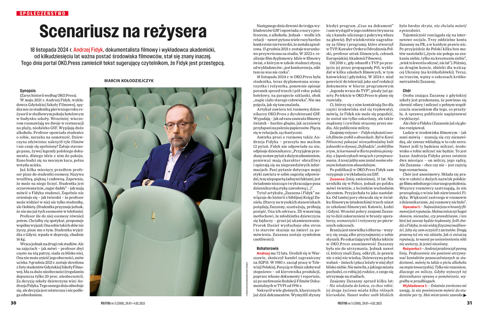 Tekst Marcina Kołodziejczyka „Scenariusz na reżysera” wchodzi w swego rodzaju polemikę z reportażem Agaty Całkowskiej „Zuzanna i Fidyk. Profesor szkoły filmowej wykorzystuje seksualnie studentkę” opublikowanym w OKO.press 18 listopada 2024 r.