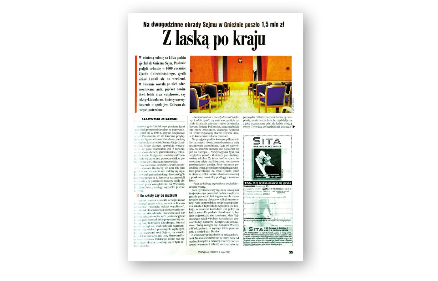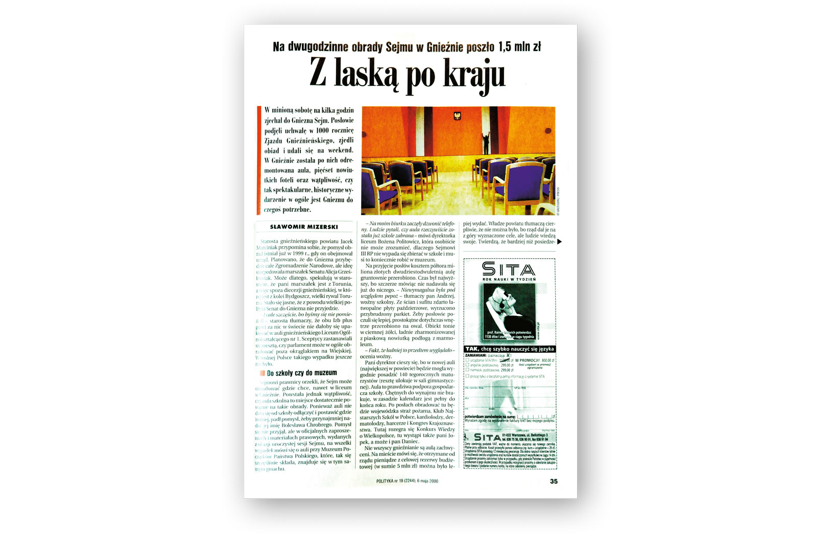 „W minioną sobotę na kilka godzin zjechał do Gniezna Sejm. Posłowie podjęli uchwałę w 1000. rocznicę Zjazdu Gnieźnieńskiego, zjedli obiad i udali się na weekend. W Gnieźnie została po nich odremontowana aula, pięćset nowiutkich foteli oraz wątpliwość, czy tak spektakularne historyczne wydarzenie w ogóle jest Gnieznu do czegoś potrzebne.