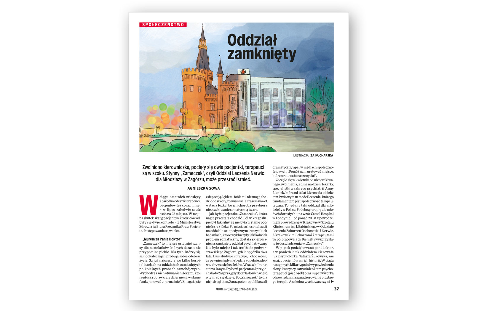 Po publikacji mojego artykułu „Oddział zamknięty” otrzymaliśmy pismo od pani Moniki Bąk, dyrektor Zespołu Szkół Specjalnych w Mazowieckim Centrum Neuropsychiatrii w Zagórzu, w którym informuje, że wymieniona w artykule szkolna wychowawczyni nie została zwolniona, lecz „złożyła wypowiedzenie i zakończyła stosunek pracy z zachowaniem okresu wypowiedzenia”.