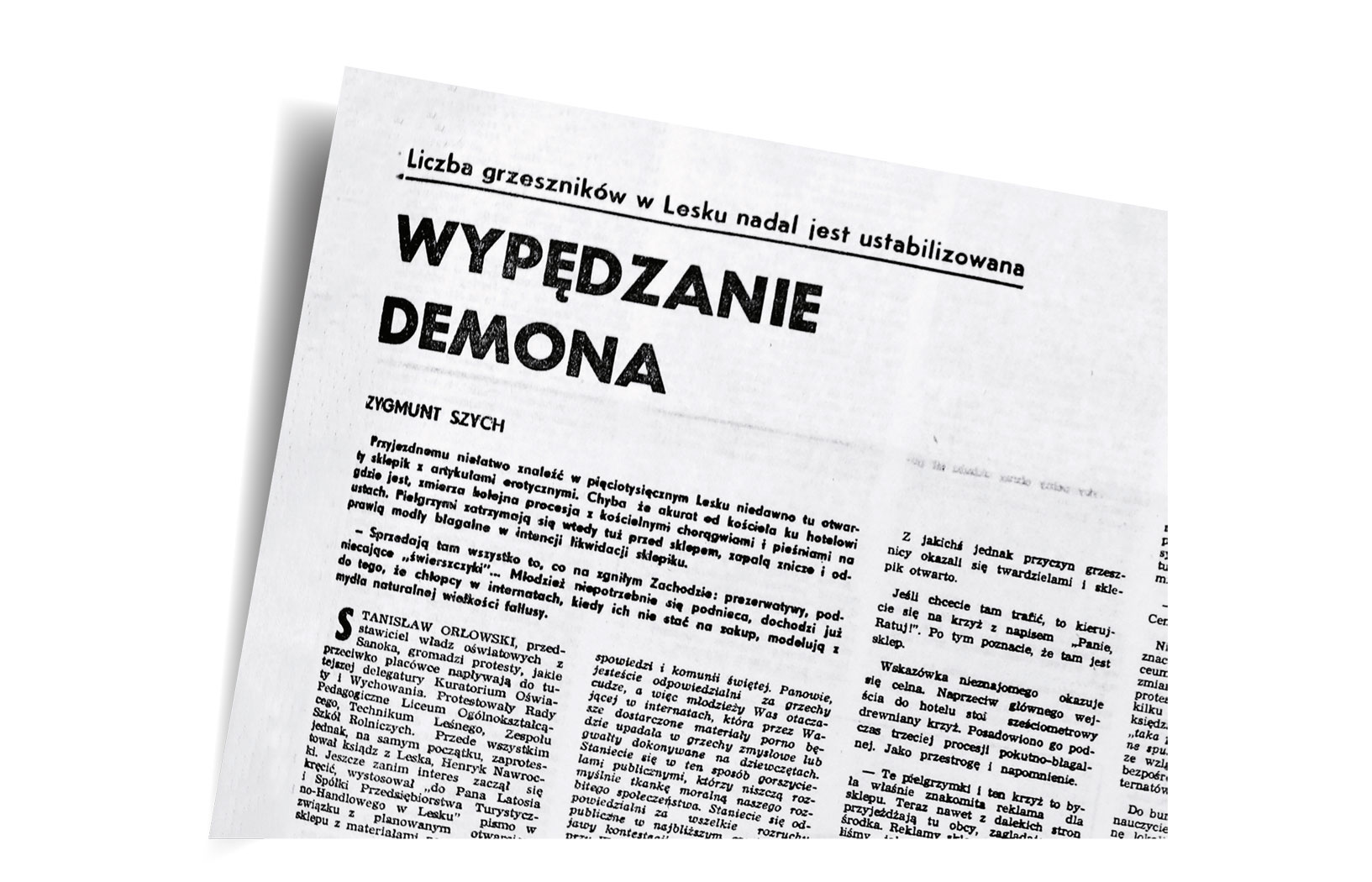 „Przyjezdnemu niełatwo znaleźć w pięciotysięcznym Lesku niedawno tu otwarty sklepik z artykułami erotycznymi. Chyba że akurat od kościoła ku hotelowi, gdzie jest, zmierza kolejna procesja z kościelnymi chorągwiami i pieśniami na ustach. Pielgrzymi zatrzymają się wtedy tuż przed sklepem, zapalą znicze i odprawią modły błagalne w intencji likwidacji sklepiku. (...)