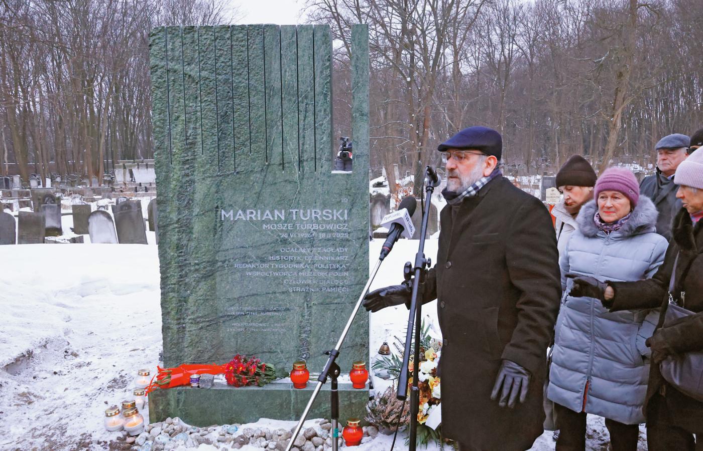 18 lutego, w pierwszą rocznicę śmierci Mariana Turskiego, grupa przyjaciół zebrała się przy jego grobie na Cmentarzu Żydowskim w Warszawie. Odsłonięto nagrobek z symbolicznymi 11 nacięciami odwołującymi się do przykazań; rabin Michael Schudrich zaintonował zaś po hebrajsku Psalm 23 (Pan jest moim pasterzem) oraz Kadisz. Pomnik nagrobny zaprojektował SENNA Kolektyw (dr Natalia Romik, Sebastian Kucharuk, Agata Korba), znany z tworzenia nowoczesnych artystycznie upamiętnień związanych z historią Żydów w Polsce. Przywraca on symbolicznie także pamięć o zamordowanej w Auschwitz rodzinie Mariana Turskiego: o ojcu Eliaszu Turbowiczu i młodszym bracie Wolfie Turbowiczu.