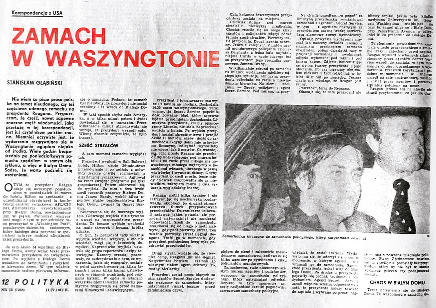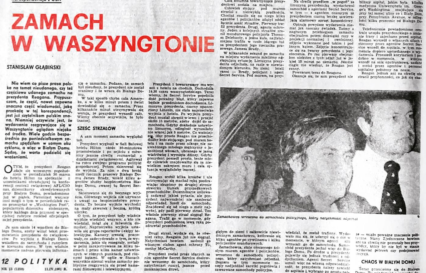 „(...) Prezydent wygłosił w Sali Balowej hotelu Hilton około 20-minutowe przemówienie i po zejściu z mównicy jeszcze chwilę rozmawiał z działaczami związkowymi. (...) Potem skierował się do wyjścia. Za nim o dwa kroki szedł rzecznik prasowy Białego Domu James Brady, wokół kilku agentów służby bezpieczeństwa Białego Domu, zwanej tu Secret Service. (...)