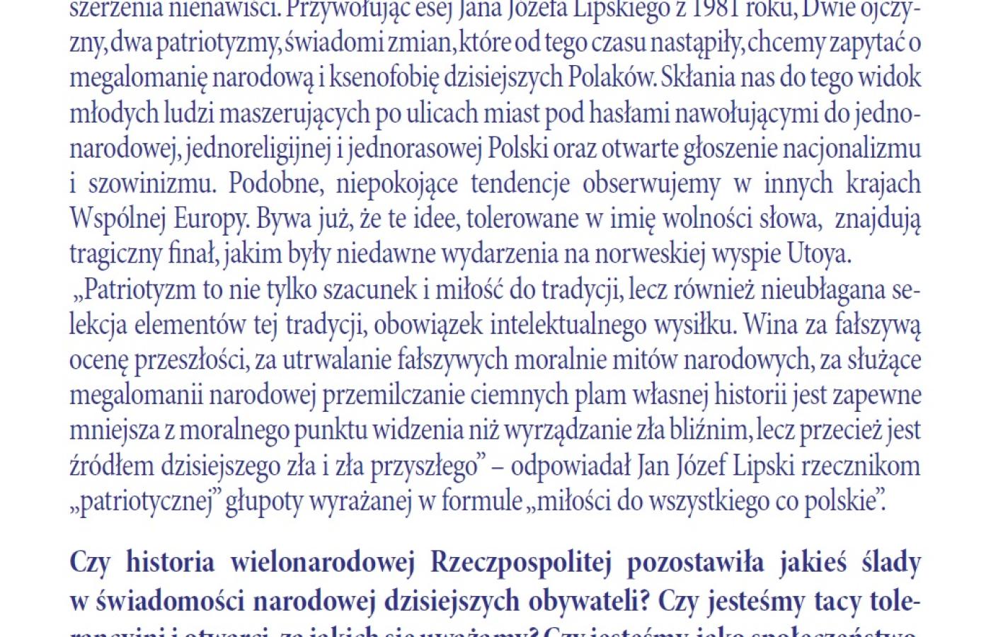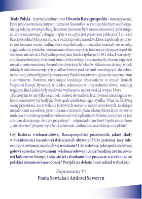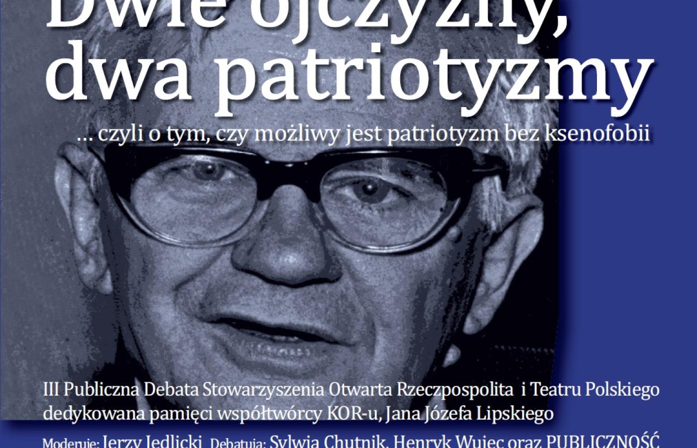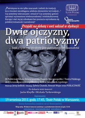w imieniu Pauli Sawickiej, Szefowej Stowarzyszenia "Otwarta Rzeczpospolita" i Andrzej Seweryna, Dyrektora Teatru Polskiego w Warszawie mam zaszczyt i przyjemność zaprosić na III Debatę Publiczną w 20 rocznicę śmierci Jana Józefa Lipskiego i 35 rocznicę powstania Komitetu Obrony Robotników, pod hasłem: "DWIE OJCZYZNY - DWA PATRIOTYZMY, czyli o tym, czy możliwy jest patriotyzm bez ksenofobii". W dyskusji, którą poprowadzi prof. Jerzy Jedlicki wezmą udział: Sylwia Chutnik, Henryk Wujec oraz Publiczność.