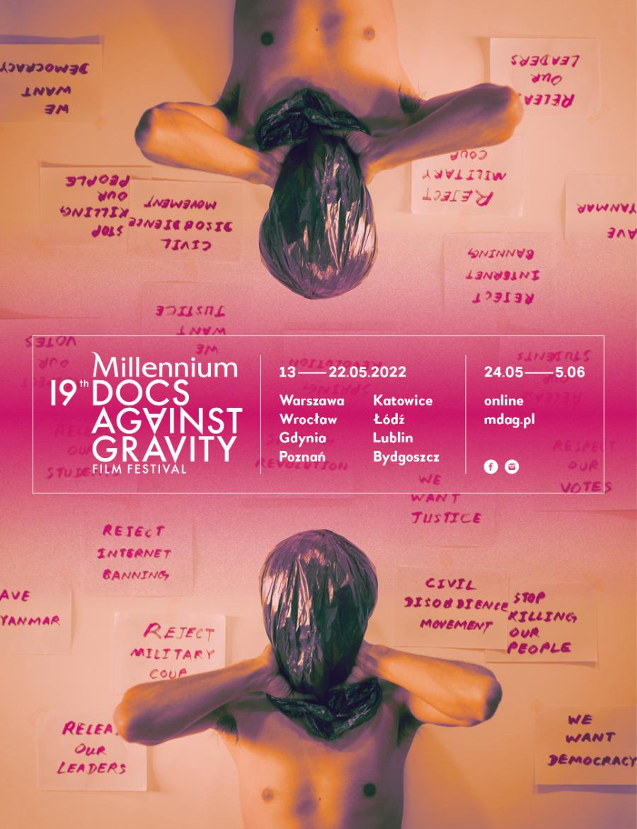 19. edycja Festiwalu Millennium Docs Against Gravity odbędzie się w dniach 12-22 maja w ośmiu miastach – Warszawie, Wrocławiu, Gdyni, Poznaniu, Katowicach, Lublinie, Bydgoszczy oraz po raz pierwszy w Łodzi. Od 24 maja do 5 czerwca potrwa część online.
