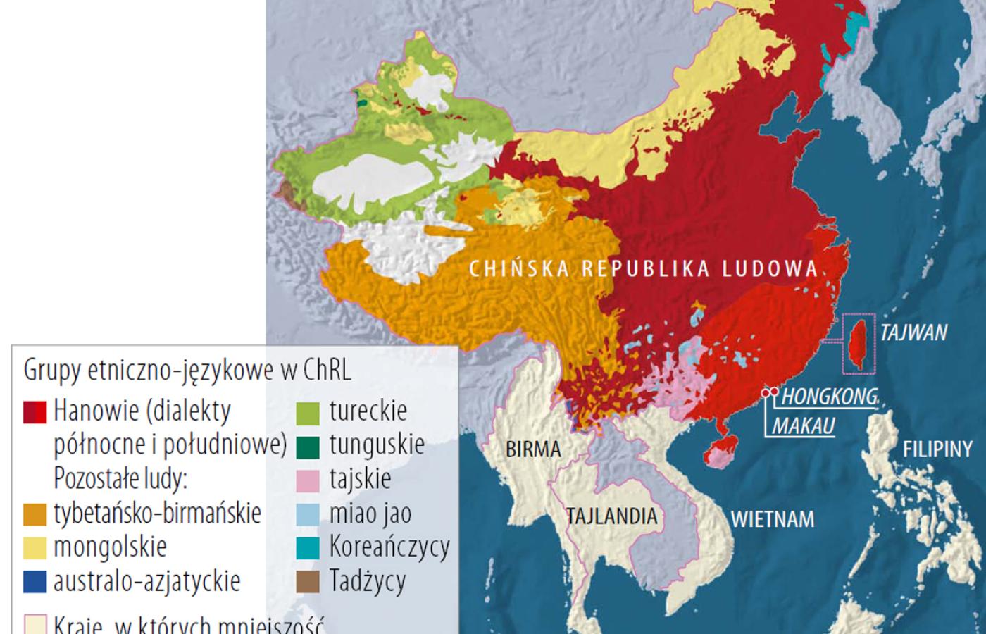 MNIEJSZOŚCI. Ok. 100 mln obywateli ChRL należy do oficjalnie uznanych 55 mniejszości narodowych (shaoshu minzu). Tylko niektóre z nich mają swoje niepodległe państwa za granicą, jak Mongołowie czy Koreańczycy. Większość tych mniejszości ma swoje siedziby na terenach peryferyjnych lub też przetrwała wewnątrz jakichś trudniej dostępnych enklaw wewnątrz Chin. Historycznie ok. 60 proc. dzisiejszego terytorium Chin to ziemie tych mniejszości. Największych problemów przysparzają dwie różniące się od Chińczyków wyznawaną religią i posiadające tradycje własnej państwowości: muzułmańscy Ujgurzy z Xinjiangu i wyznający lamaistyczną odmianę buddyzmu Tybetańczycy, obie z aktywną emigracją polityczną.