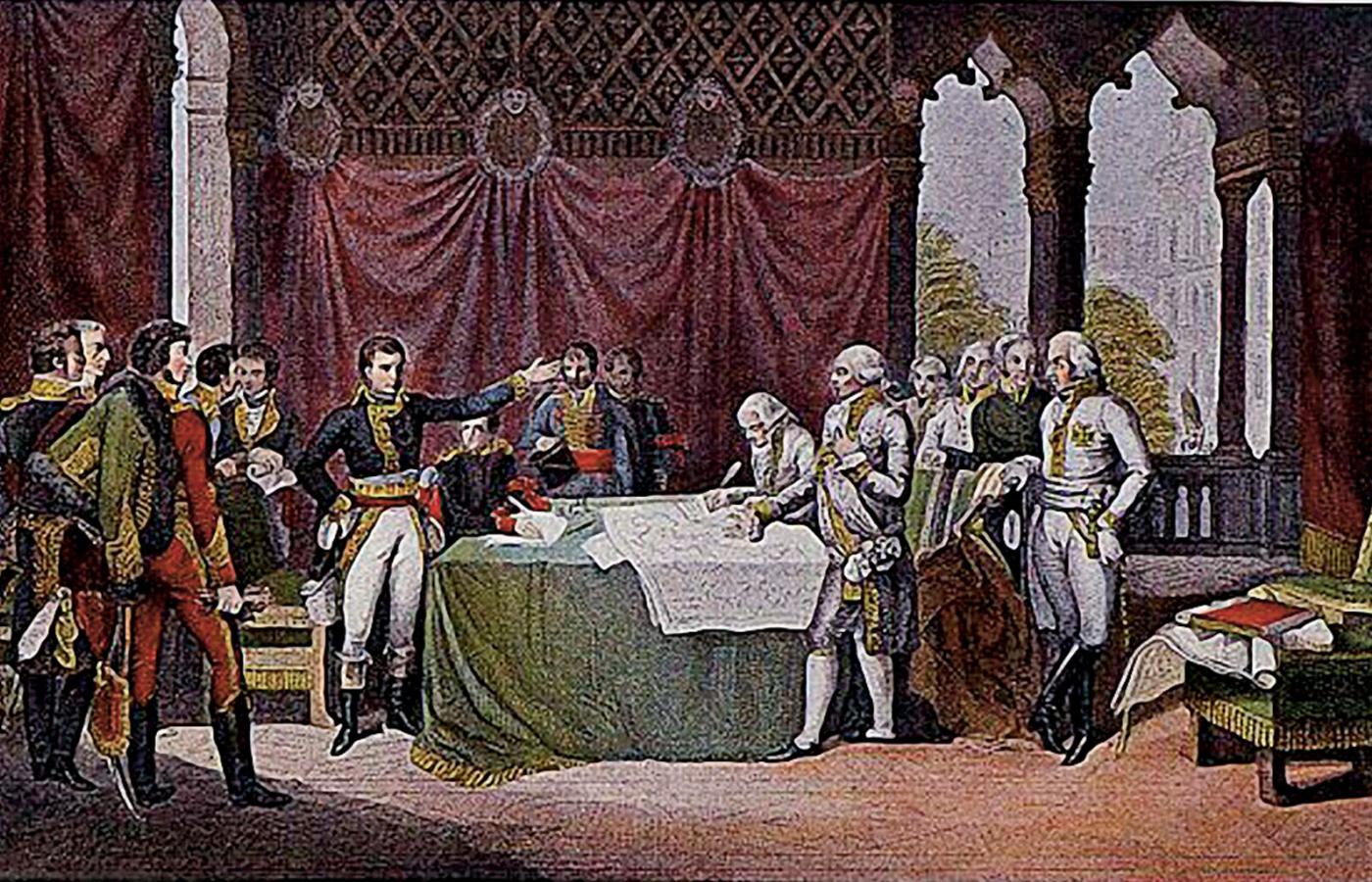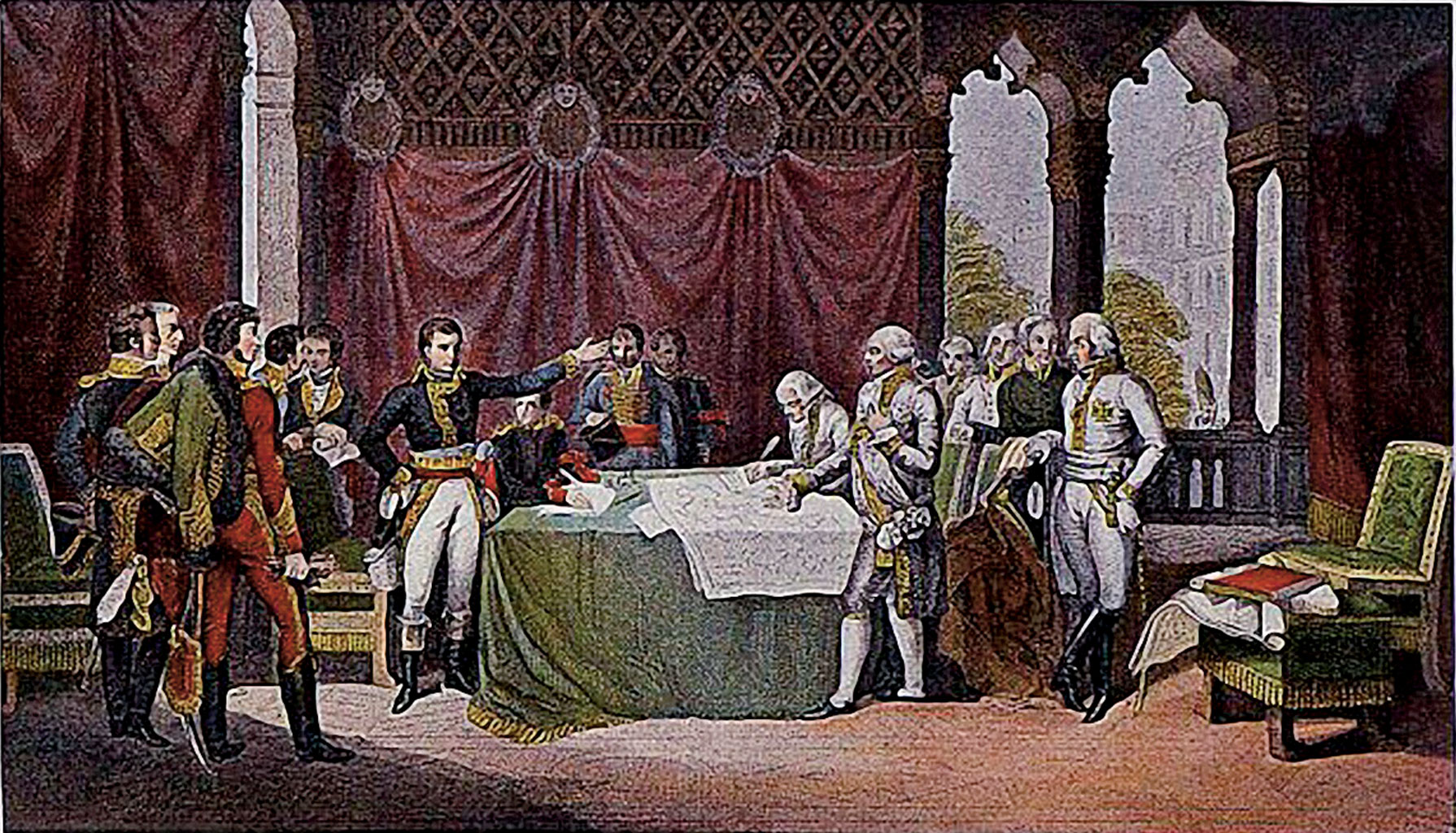 Dyplomacja cesarza i cara. Polityką zagraniczną Francji kierował Napoleon Bonaparte, skupiając w swym ręku najważniejsze inicjatywy. O ile Charles-Maurice de Talleyrand, jako minister spraw zagranicznych, zachowywał pewną niezależność działania, o tyle Hugues Maret, pełniący tę funkcję w 1812 r., był tylko posłusznym wykonawcą poleceń cesarza Francuzów. W Rosji polityką zagraniczną kierował Aleksander, choć w szczątkowej formie funkcjonowała, ustanowiona jeszcze w XVIII w., kolegialna organizacja polityki zagranicznej. Car powołał wprawdzie w 1802 r. ministra spraw zagranicznych, ale zachowano kolegium spraw zagranicznych pod kierownictwem tegoż ministra. Pamiętać jednak należy, że to Aleksander decydował osobiście we wszystkich zasadniczych sprawach polityki zagranicznej.