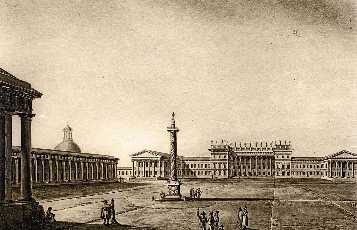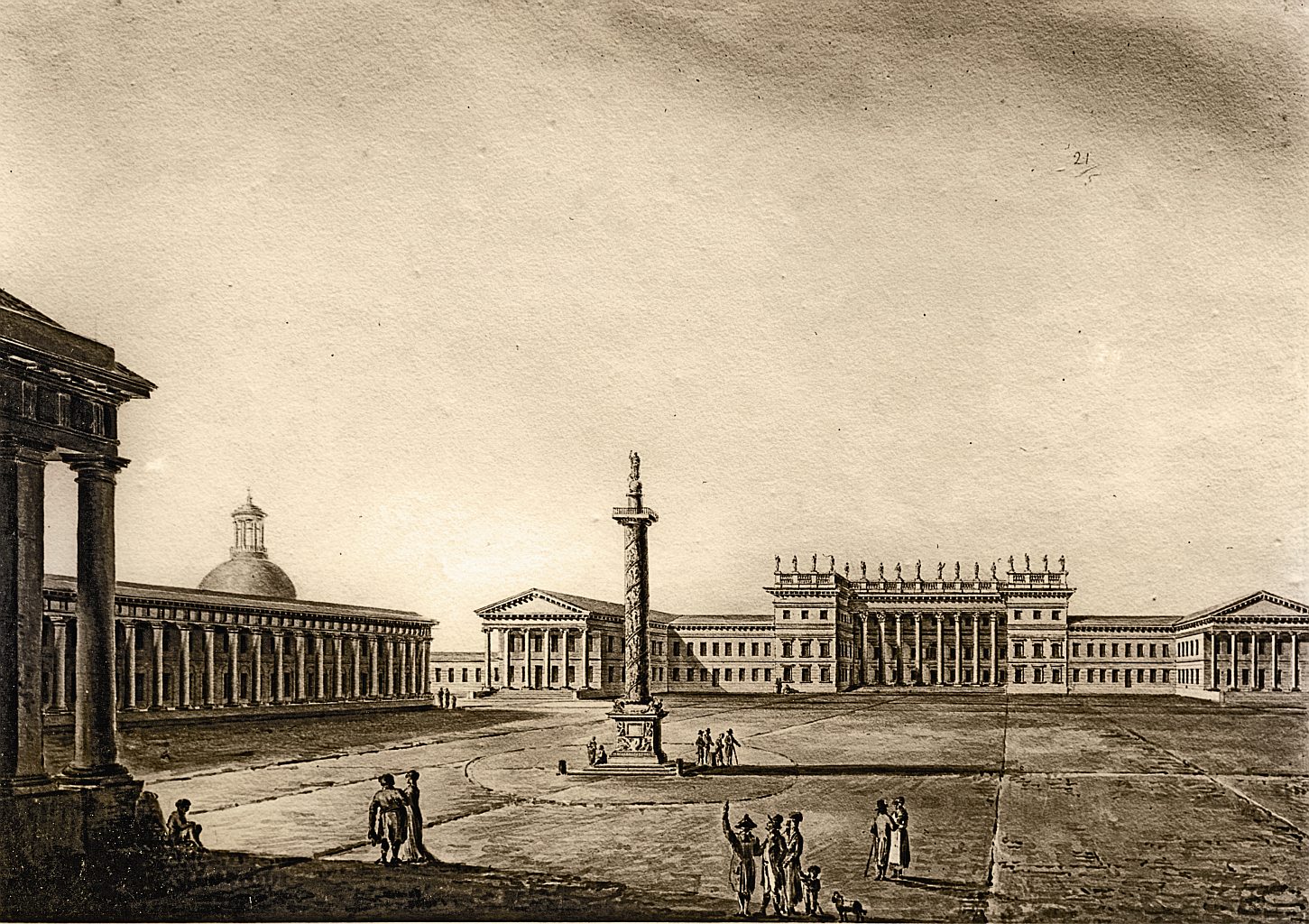Z INSPIRACJI WIELKIEGO BUDOWNICZEGO. Pod koniec czerwca 1812 r. Polacy wierzyli w rychłą restytucję Królestwa Polskiego. Z patriotycznego uniesienia zrodziły się projekty upamiętnienia Napoleona – jak mniemano – wskrzesiciela i patrona odrodzonej Polski. Prócz sposobności do snucia pomysłów na pomnik, stwarzały one okazję do dyskusji na temat jego otoczenia architektonicznego. Źródłem inspiracji była urbanistyka stolicy napoleońskiego imperium. Nie pierwszy raz w tej epoce na ten temat rozprawiano. Napoleona postrzegano nie tylko jako wielkiego wodza, ale i wybitnego budowniczego, bynajmniej nie w przenośni. W grudniu 1808 r., na rocznicę koronacji cesarza, „Gazeta Warszawska” opublikowała panegiryk zawierający znamienne stwierdzenie: „Na skinienie Napoleona powstają w stolicy [Paryżu] gromadnie nowe gmachy, pałace, kolumny. On rozkazuje, a kanały niezliczone rozmnażają się po całej Francji”.