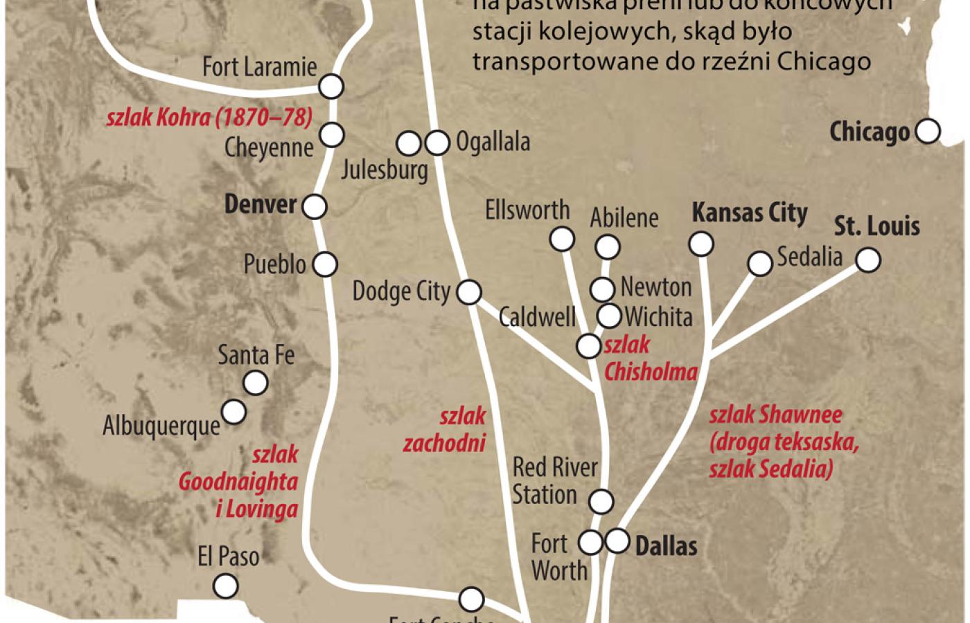 Najbardziej znaną ze stałych tras był szlak Chisholma, Chisholm Trail, stopniowo powiększany aż do 400 m szerokości. Łącznie przeszło nim znad Red River w Teksasie do stacji w Abilene ok. 3 mln sztuk bydła, a wydeptane przez nie zagłębienia widoczne są po dziś dzień. Po wielu próbach okazało się, że idealna wielkość pędzonego stada to 2,5 tys. sztuk, natomiast rekordowo wielkie stado, przepędzone w 1869 r., liczyło 15 tys. sztuk. Nad tak ogromnymi stadami trudno jednak było zapanować.