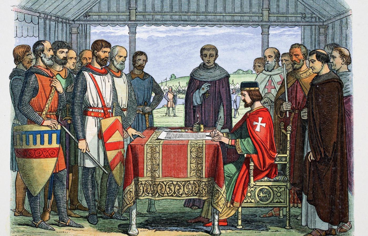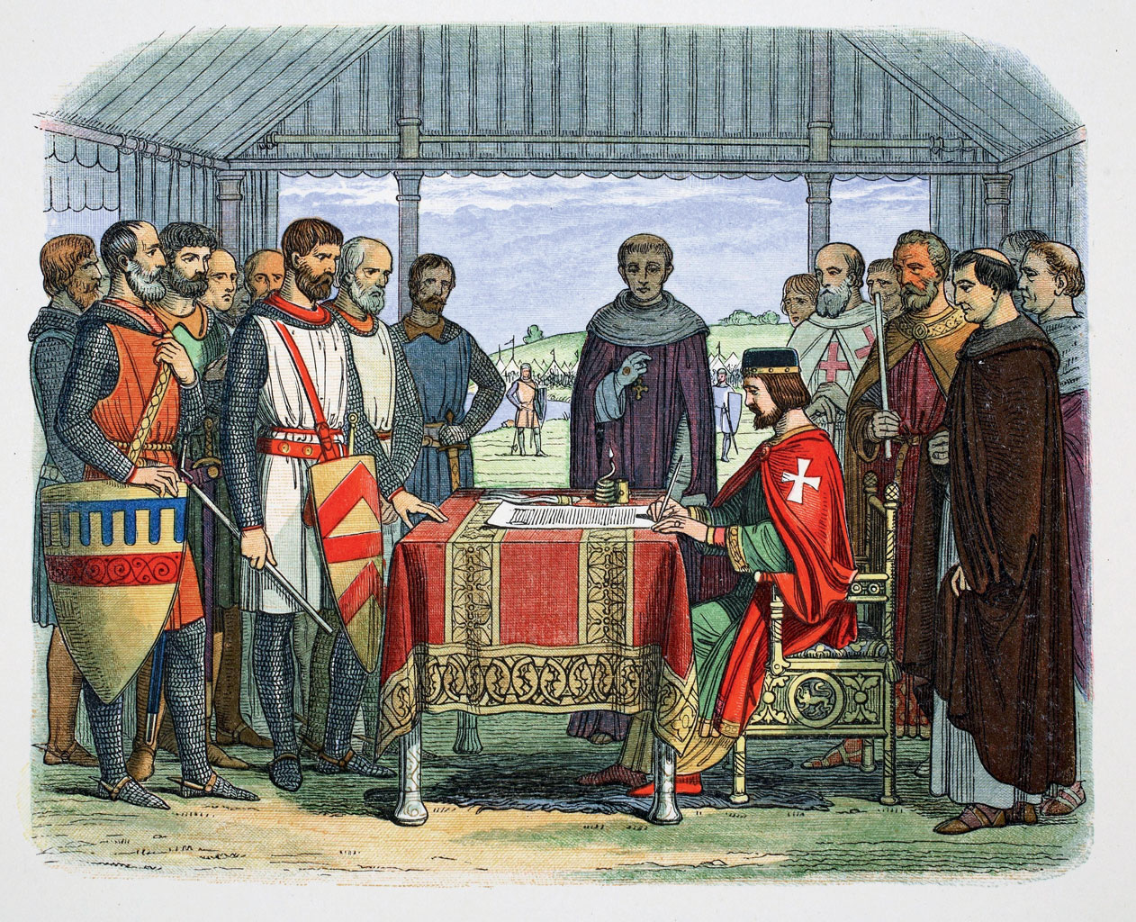 Tradycje Wielkiej Karty Wolności. Wspomniany proces niewątpliwie zapoczątkowuje Wielka Karta Wolności (Magna Carta Libertatum, 1215). Dokument ten nie powstał jednak z myślą o zapewnieniu wolności szerokim rzeszom. Przeciwnie, Karta została wymuszona na królu Janie bez Ziemi w obozie wojskowym na błoniach Runnymede przez egoistycznie myślącą klasę baronów. Byli oburzeni z powodu nieudolności monarchy, który nie potrafił skutecznie bronić ich posiadłości na kontynencie (stąd zresztą wziął się jego przydomek).