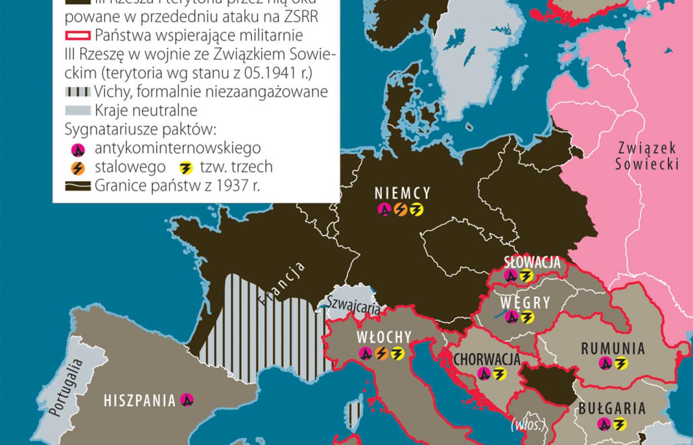 Układ sił. II wojnę światową zdominowały zmagania największych ówczesnych potęg światowych. Niemiec, które tę wojnę zaplanowały, przygotowały i świadomie rozpętały. Japonii, która – bacznie obserwując międzynarodowy układ sił – dokonywała ekspansji w Azji Wschodniej i w strefie Pacyfiku. Obu zachodnioeuropejskich mocarstw – Wielkiej Brytanii i Francji, zainteresowanych zachowaniem status quo. Stanów Zjednoczonych, których potęgę ta wojna miała pokazać w całej okazałości. I wreszcie stalinowskiego Związku Sowieckiego, realizującego swe własne cele.