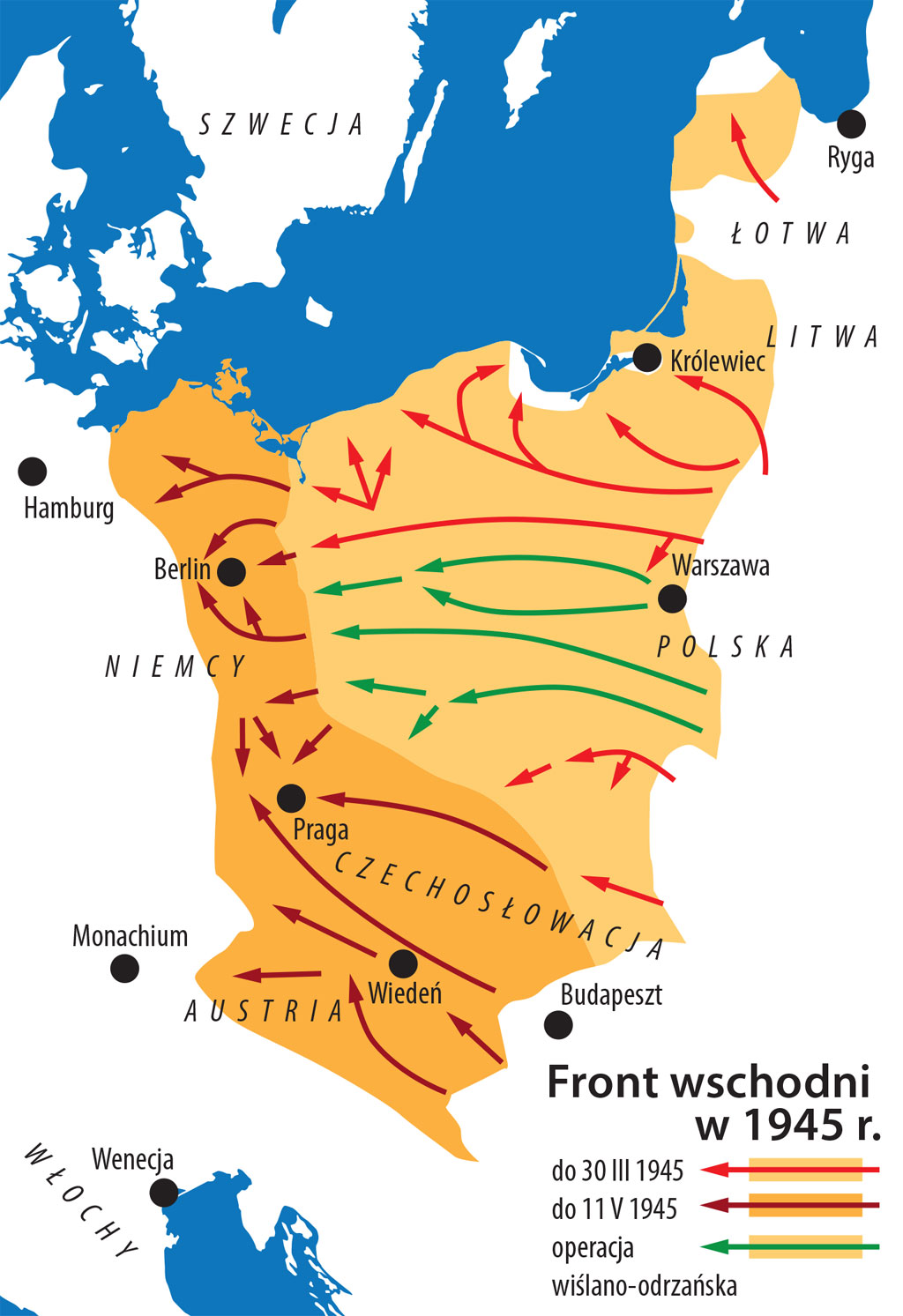 Operacja wiślańsko-odrzańska, faktycznie planowana jako uderzenie znad Wisły wprost na Berlin bez pauzy operacyjnej (stolicę Niemiec zamierzano zdobyć najpóźniej w lutym 1945 r.), została zainicjowana wspomnianym uderzeniem 1 Frontu Ukraińskiego 12 stycznia i spotęgowana ofensywą 1 Frontu Białoruskiego 14 stycznia 1945 r. W jej wyniku wojska niemieckiej Grupy Armii A (9 Armia, 4 Armia Pancerna) zostały rozbite lub zmuszone do odwrotu, zaś Armia Czerwona, zajmując m.in. Warszawę, Kraków i Łódź, wyparła Niemców z obszarów centralnej Polski, następnie opanowała strategiczny śląski okręg przemysłowy, całą Wielkopolskę i przeniosła działania wojenne na ziemie rdzennie niemieckie. Jej czołówki 31 stycznia dotarły do Odry zaledwie 60 km od Berlina. Była to najbardziej efektywna operacja zaczepna Armii Czerwonej spośród wszystkich toczonych przeciw Wehrmachtowi.