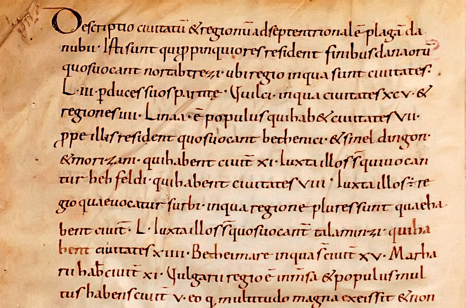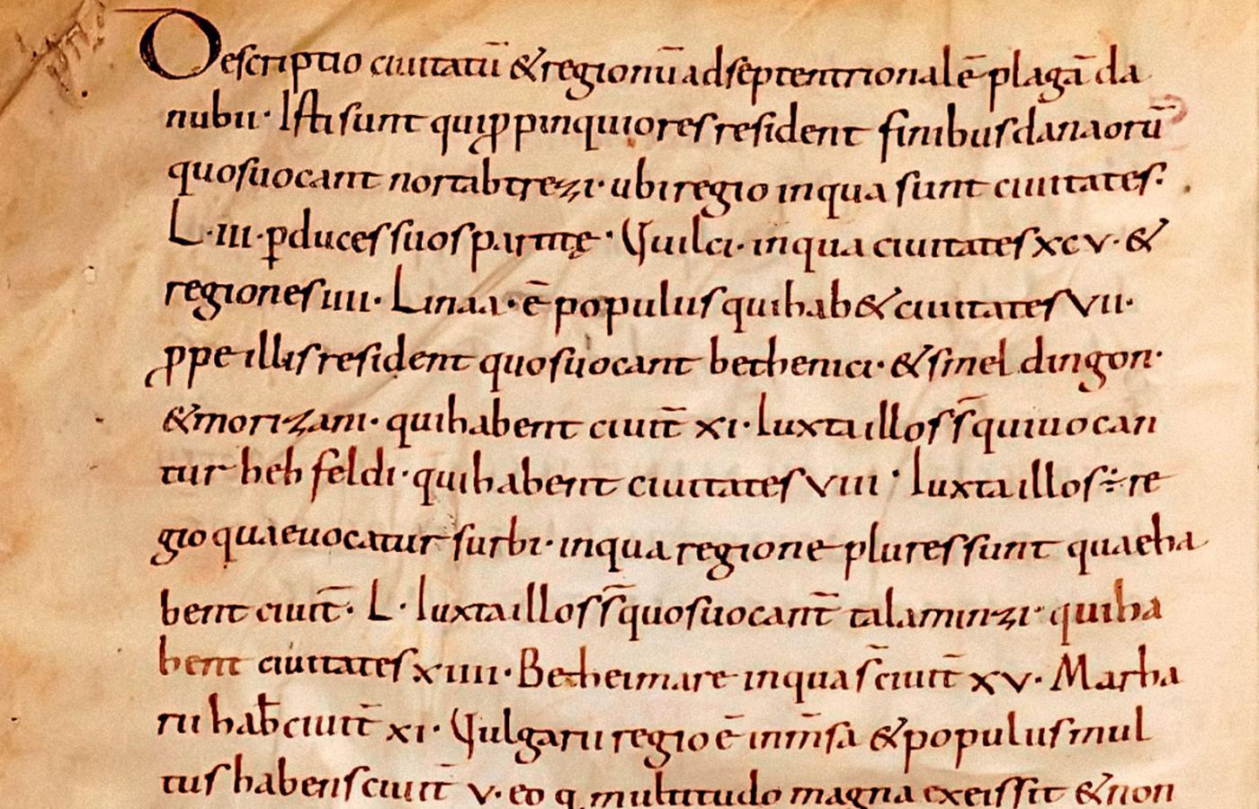 (14) Osterabtrezi, in qua civitates plus quam C sunt. (15) Miloxi, in qua civitates LXVII. (16) Phesnuzi habent civitates LXX. (17) Thadesi plus quam CC urbes habent. (18) Glopeani, in qua civitates CCCC aut eo amplius. (19) Zuireani habent civitates CCCXXV. (20) Busani habent civitates CCXXXI. (21) Sittici regio inmensa populis et urbibus munitissimis. (22) Stadici, in qua civitates DXVI populousque infinitus. (23) Sebbirozi habent civitates XC. (24) Unlizi populus multus civitates CCCCXVIII. (25) Neriuani habent civitates LXXVIII. (26) Attorozi habent civitates CXLVIII, populus ferocissimus. (27) Eptaradici habent civitates CCLXIII. (28) Uuilerozi habent civitates CLXXX. (29) Zabrozi habent civitates CCXII. (30) Znetalici habent civitates LXXIIII. (31) Aturezani habent civitates CIIII. (32) Chozirozi habent civitates CCL. (33) Lendizi habent civitates XCVIII. (34) Thafnezi habent civitates CCLVII. (35) Zeriuani, quod tantum est regnum, ut ex eo cuncte genetes Sclauorum exorte sint et originem, sicut affirmant, ducant. (36) Prissani civitates LXX. (37) Uelunzani civitates LXX. (38) Bruzi plus est undique quam de Enisa ad Rhenum (39) Uuizunbeire (40) Caziri civitates C. (41) Ruzzi. (42) Forsderen. (43) Liudi.