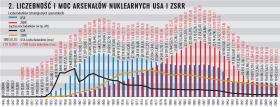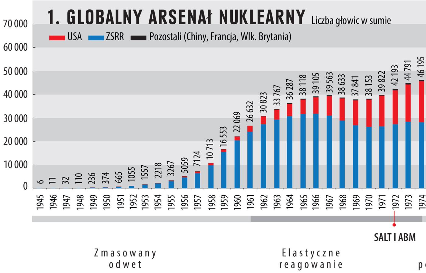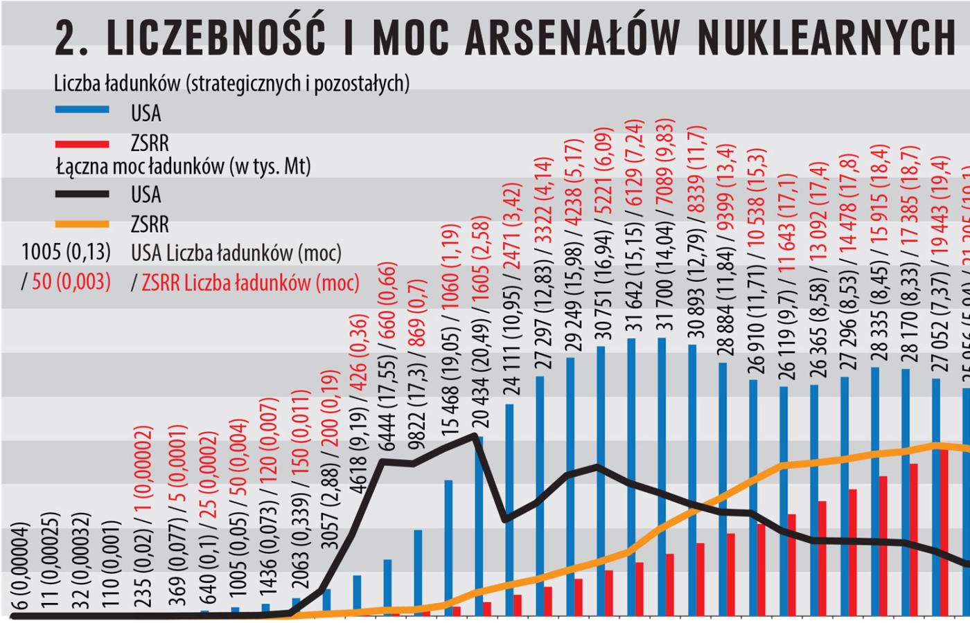 Wbrew tradycyjnemu określeniu „bomba” ładunki nuklearne wykorzystywano w różnych rodzajach broni – począwszy od klasycznych bomb lotniczych, przez różnego rodzaju i wielkości głowice pocisków balistycznych i manewrujących, pociski artyleryjskie, miny czy torpedy w okrętach podwodnych. Liczbę wszystkich ładunków w posiadaniu piątki mocarstw atomowych przedstawiamy na wykresie 1. W czasach zimnej wojny był to praktycznie globalny arsenał jądrowy.