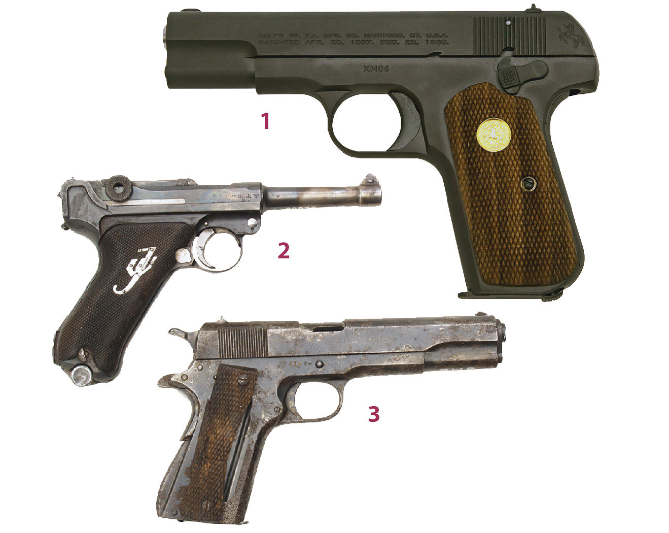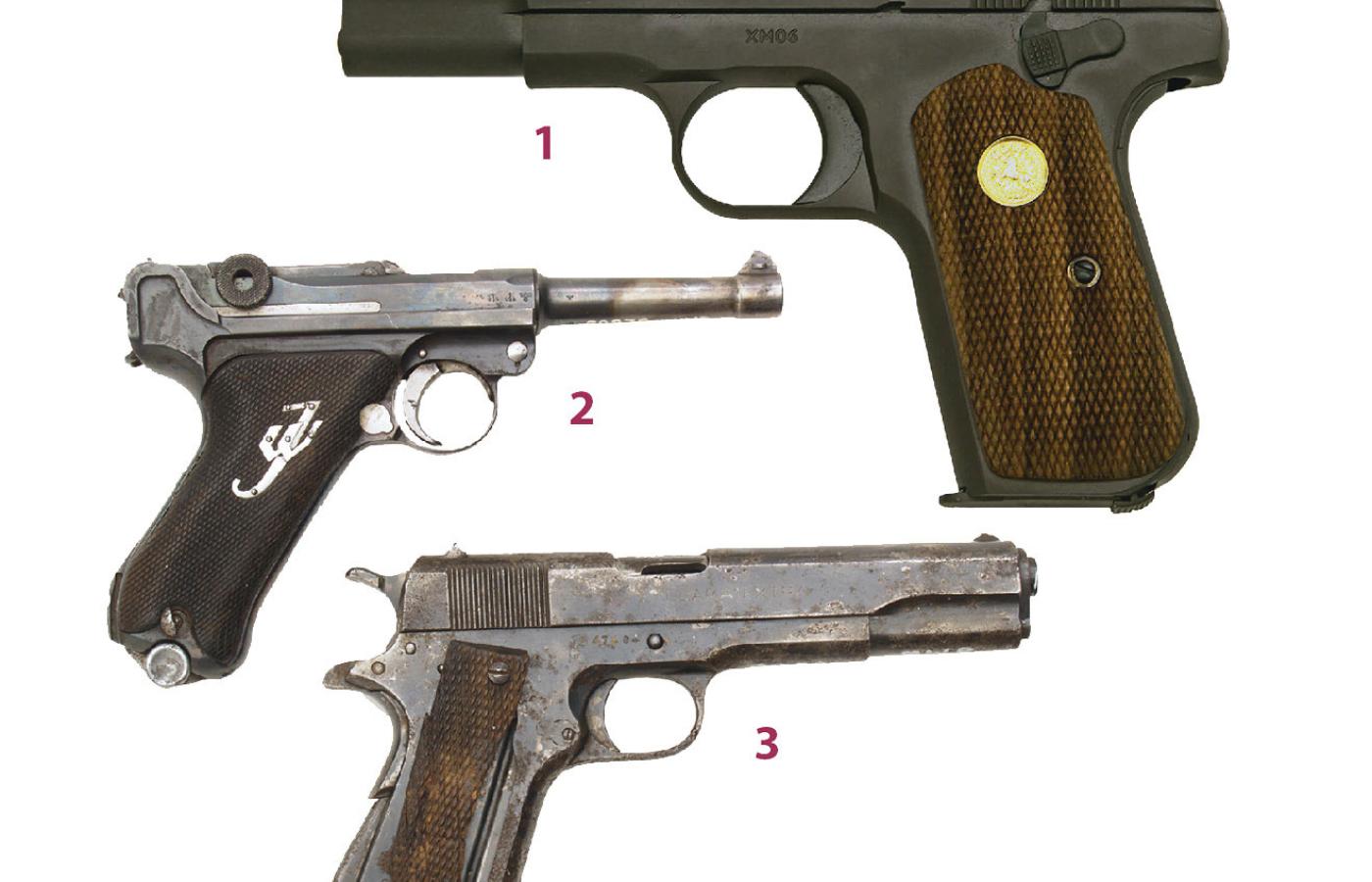 1. Colt M1903, kal. 9 mm, magazynek pudełkowy, 8 nabojów, masa: 0,89 kg (także w wersji kal. 7,65 mm)