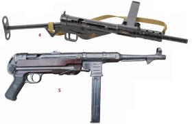 5. MP 40 (tzw. szmajser), kal. 9 mm, magazynek pudełkowy, 32 naboje, masa: 4,61 kg, szybkostrzelność: 500/min, zasięg skuteczny: 150–200 m