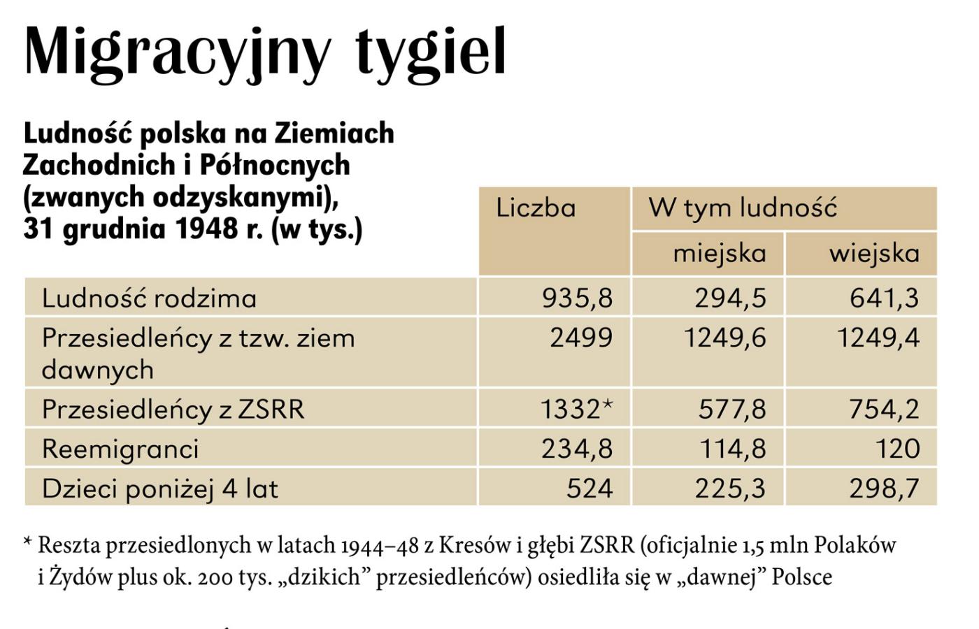 Migracyjny tygiel. Nie brakowało jednocześnie czynników sprzyjających integracji. Większość Niemców wysiedlono, duża część społeczności żydowskiej wyemigrowała po pogromach w Krakowie (sierpień 1945 r.) i Kielcach (lipiec 1946 r.), ustawą z 8 stycznia 1951 r. uregulowano kwestie obywatelstwa. Ważne role integracyjne grały szkoła, zatrudnienie, Kościół, działalność w organizacjach społecznych i politycznych. Powstające na tej podstawie nowe więzi międzyludzkie stopniowo prowadziły do wygasania antagonizmów i łagodzenia kontrastów. Najszybciej działo się to w miastach, zwłaszcza dużych, bardziej podatnych na przemiany modernizacyjne. Należy również pamiętać, że wśród przesiedleńców był duży odsetek ludzi młodych, dynamicznych, myślących raczej o przyszłości niż rozpamiętujących przeszłość. Zwłaszcza że opuszczone Kresy – najbiedniejszy region biednej II Rzeczpospolitej, targany waśniami etnicznymi – bynajmniej nie były szczęśliwą Arkadią. Ziemie Odzyskane dawały zaś niemałe możliwości awansu, zarówno kulturowego, jak ekonomicznego. Nic też dziwnego, że przyrost naturalny był na ziemiach poniemieckich, zwłaszcza poza tradycyjnymi obszarami autochtonicznymi (Śląsk Opolski, Mazury), znacznie wyższy niż w reszcie Polski w granicach z 1939 r.