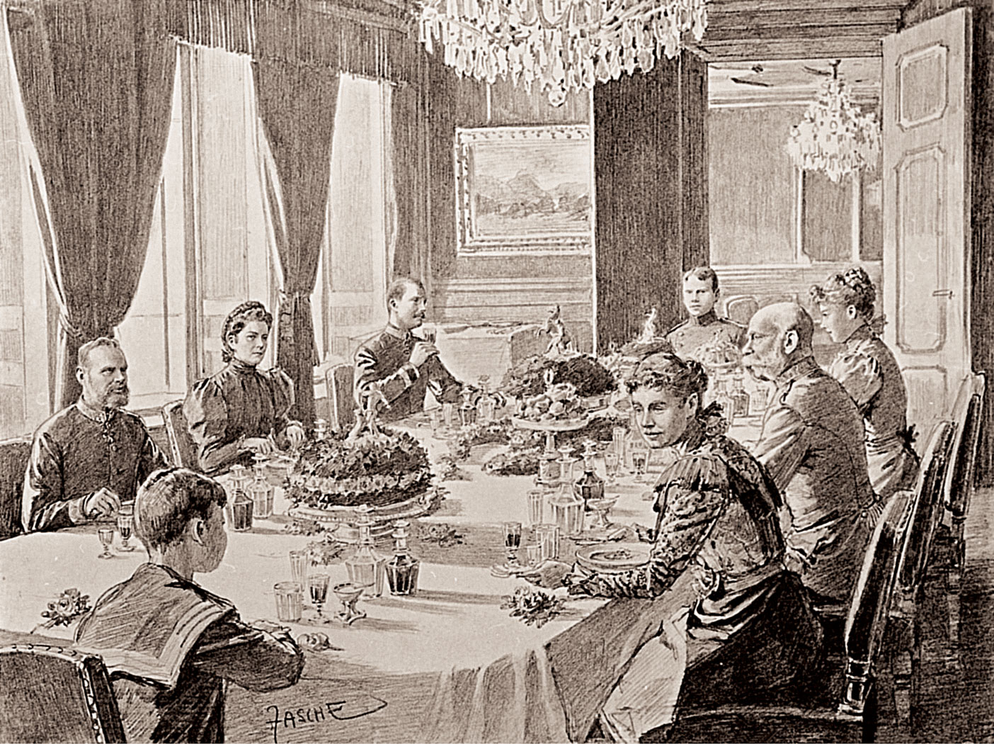 Obiady rodzinne. Rozpoczynały się – jak podaje John Van der Kiste, autor książki o życiu prywatnym Franciszka Józefa – o godz. 17. Na początek szła zupa, często była to szczególnie lubiana przez cesarza kminkowa. Dalej przystawki, choć monarcha w nich nie gustował, a wielu jego biografów twierdzi, że w ogóle ich nie jadał. Na główne danie często serwowano tafelspitz, czyli wołowinę duszoną z jarzynami, za którą przepadał, toteż nadworni kucharze doprowadzili przyrządzanie tej, na pierwszy rzut oka prostej, potrawy do prawdziwej maestrii. Woły przeznaczone na cesarski stół pasły się w madziarskiej puszcie, do Wiednia zaś pędzono je, by długotrwały i niezbyt intensywny wysiłek dodatkowo poprawił jakość mięsa. Wybrane kawałki obłożone warzywami długo przygotowywano na maleńkim ogniu, aż mięso było tak miękkie, że niemal rozpływało się w ustach.