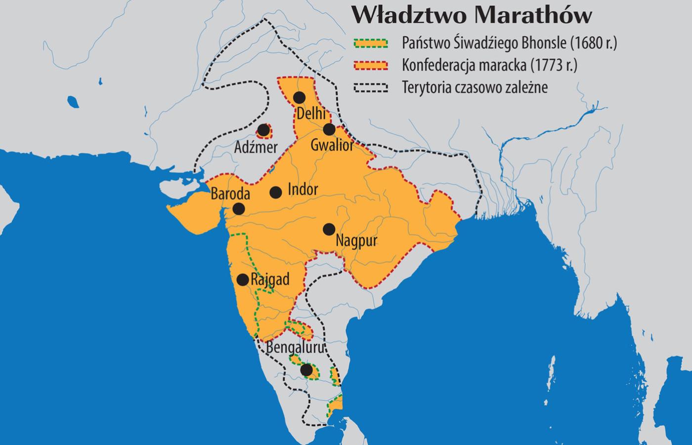 Hinduscy wojownicy. Termin Marathowie odnosi się do hinduskich wojowników wywodzących się z zachodniej części Dekanu (dzisiejszy indyjski stan Maharasztra). Początki ich potęgi sięgają drugiej połowy XVII w., kiedy zjednoczeni przez charyzmatycznego przywódcę Śiwadźiego Bhonsle wystąpili zbrojnie przeciwko Adil Śahom z sułtanatu Bidźapuru oraz prowadzącym ekspansję na południu Mogołom. Za datę początku państwa marackiego przyjmuje się 1674 r., w którym Śiwadźi przeprowadził swą ceremonialną koronację i przyjął królewski tytuł Ćhatrapati, obierając wybudowany przez siebie potężny fort Rajgad za stolicę. Imperium, którego podwaliny stworzył, było na tyle silne, że ani jego śmierć w 1680 r., ani natychmiastowa ofensywa podjęta przez mogolskiego cesarza Aurangzeba nie powstrzymały dalszej ekspansji Marathów. Ogromna, lecz mało efektywna, ciężka armia mogolska nieustannie była nękana błyskawicznymi atakami lekko wyposażonych partyzanckich oddziałów marackich, ukrywających się w trudno dostępnych górach Maharasztry i unikających podejmowania otwartych bitew.