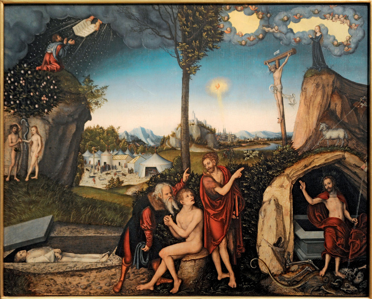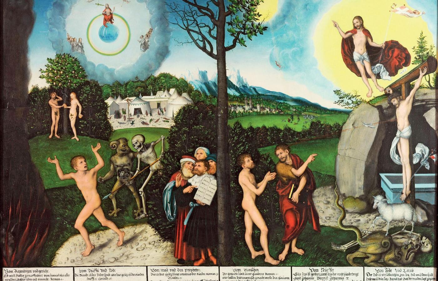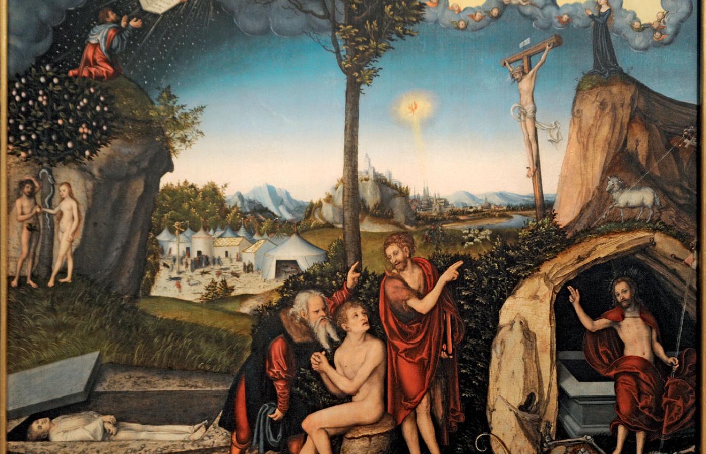 Łaska i prawo. Wkrótce łaska została skonfrontowana z prawem. W 1528 r. powstał drzeworyt, umieszczony na jednym z wydań homilii Lutra, w którym opisana wyżej scena, uzupełniona o motyw triumfu Chrystusa nad śmiercią, zajmuje prawą połowę kompozycji. Poszczególne motywy znalazły znamienne odpowiedniki po lewej stronie: drzewo krzyża, na którym wisi Chrystus, zostało zestawione z drzewem wiadomości dobrego i złego, pod którym stoją Adam i Ewa; Maria w momencie poczęcia – z Mojżeszem otrzymującym tablice przykazań; a Chrystus depczący śmierć – z grzesznikiem w grobie. Pośrodku widnieje drzewo, pod którym siedzi nagi mężczyzna podpisany jako Adam; zwracają się do niego prorocy: po lewej starotestamentowy, po prawej – nowotestamentowy, czyli Jan Chrzciciel, wskazujący na Chrystusa. Gałęzie drzewa są po lewej stronie uschnięte, po prawej zaś ulistnione, a więc sens całej tej złożonej kompozycji można streścić następująco: przestrzeganie prawa nie jest gwarancją życia wiecznego, a jedynym źródłem łaski i zbawienia jest ukrzyżowany i zmartwychwstały Chrystus. Podobna kompozycja powtórzyła się na obrazie tablicowym, przechowywanym obecnie w Galerii Narodowej w Pradze, a datowanym na 1529 r.