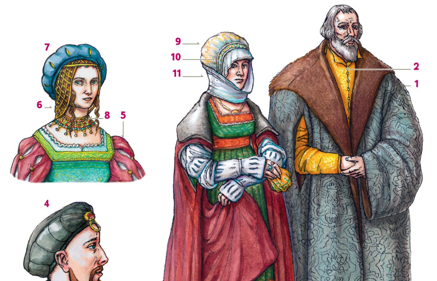 Pod koniec epoki Jagiellonów, w dobie renesansu, wzorce w dziedzinie mody czerpali Polacy z Włoch. Niemałą rolę w ich adaptacji odegrał dwór Zygmunta I Starego i Bony Sforzy. Popularnym męskim reprezentacyjnym okryciem wierzchnim była znana już wcześniej szuba (1) – luźna szata z długimi, dekoracyjnie rozciętymi rękawami, podbijana futrem i zaopatrzona również futrzanym, obszernym kołnierzem, szyta z drogich tkanin (włoskie adamaszki i aksamity). Pod nią mężczyźni nosili różnego typu kaftany (2): przejęty z mody hiszpańsko-niemieckiej wams – lekko podwatowany, zapinany z przodu pod szyję, z długimi rękawami, dopasowany w talii i zakończony krótką baskijką, lub na wzór włoski sajan – nieco luźniejszy, od talii do kolan układany w fałdy, z krótkimi bufiastymi rękawami i dużym prostokątnym dekoltem. Koszula (3), pełniąca w poprzedniej epoce funkcję bielizny, awansowała do roli ozdobnego elementu garderoby, szyta z cienkich tkanin, marszczonych ozdobnie przy szyi. Panowie nosili obcisłe spodnie z długimi nogawkami, wywodzące się z gotyckich nogawic, lub nieco luźniejsze, wpuszczane w buty z cholewami. Strój wieńczył czepiec (4) – płaski, okrągły, zmarszczony na przodzie i opatrzony ozdobną broszą. Włosy ścinano krótko, zapuszczano natomiast wąsy i brody.