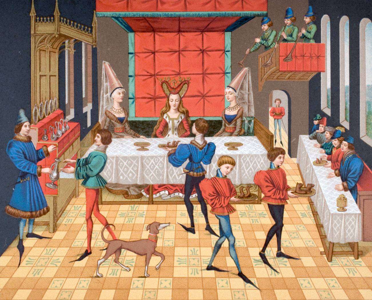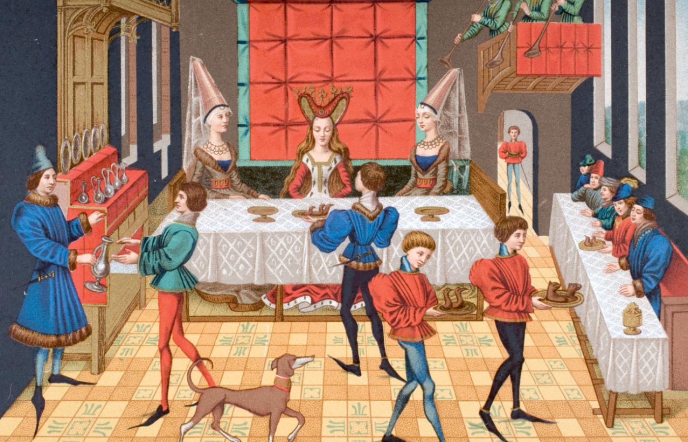 Ceremoniał przy stole. Królowie i ich żony mieli odrębne kuchnie i spiżarnie. Jadali osobno, każde w gronie swych dworzan i gości. W salach rozstawione były stoły – główny dla króla lub królowej i najważniejszych osobistości oraz dwa lub więcej bocznych.