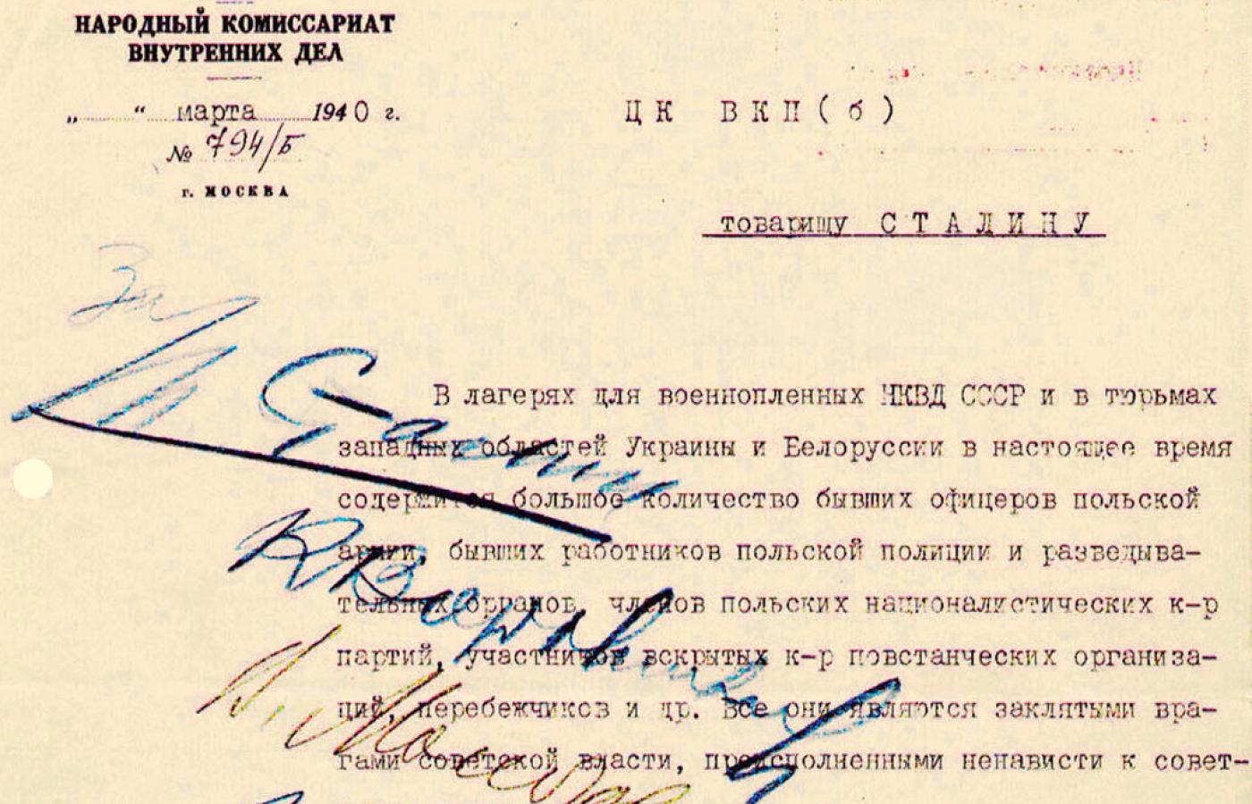 Dalsze hurtowe rozpatrywanie „wniosków oskarżenia” zostało nagle wstrzymane przez komisarza ludowego spraw wewnętrznych Ławrientija Berię, a wyroki sprzed zaledwie kilku dni unieważniono. Sprawa dalszego losu polskich jeńców wojennych znalazła się w porządku obrad Biura Politycznego KC WKP(b) z 5 marca 1940 r. Podstawą jej rozpatrywania miała być znana notatka Berii, wręczona Józefowi Stalinowi zaledwie kilka godzin przed posiedzeniem.