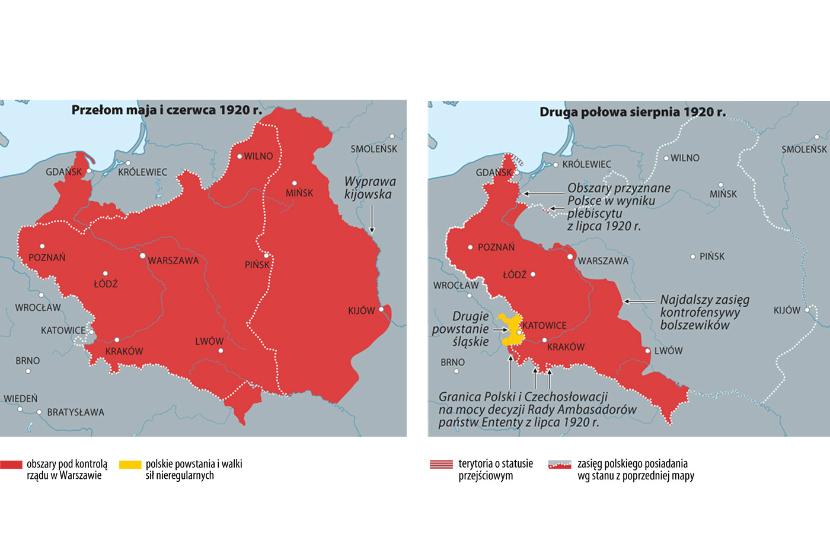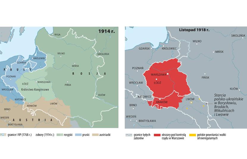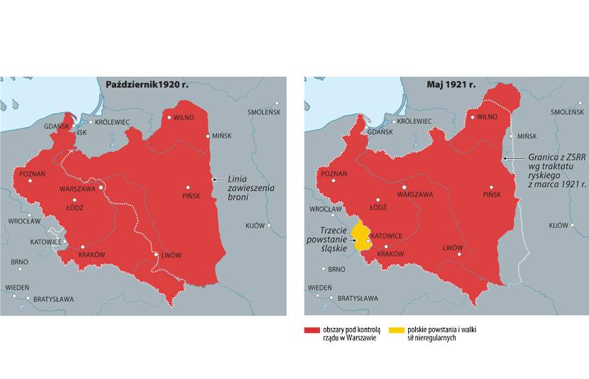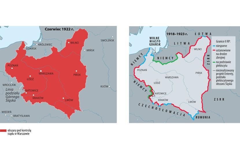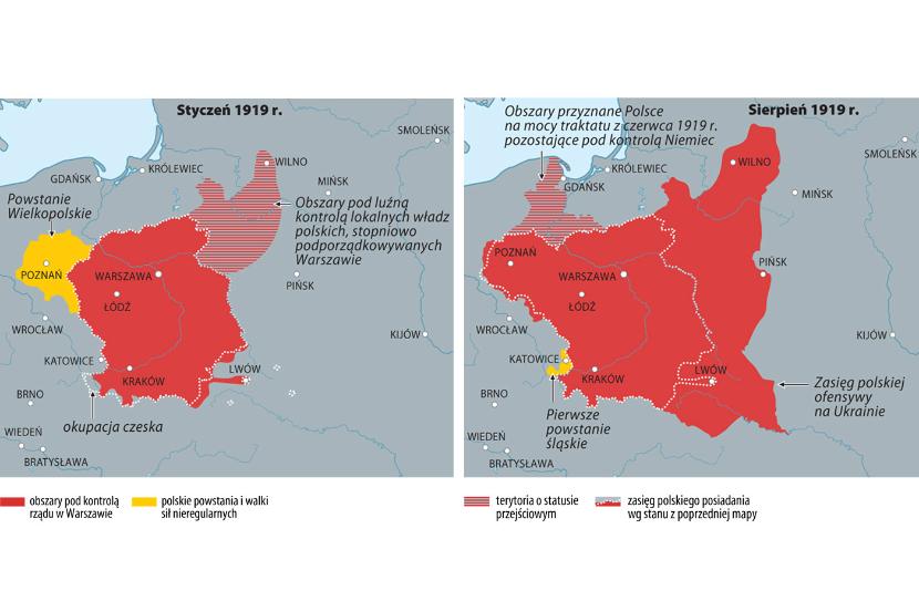 Mapy obrazują kształtowanie się terytorium Polski od pierwszych dni po zakończeniu działań wojennych do ostatecznego uznania granic II RP wiosną 1923 r. Pod względem prawnym granice te zostały wykreślone na podstawie traktatu wersalskiego, traktatu ryskiego oraz decyzji Rady Ambasadorów państw Ententy i Rady Ligi Narodów (interpretacja wyników plebiscytów, uznanie status quo, czyli granic wywalczonych przez II RP).