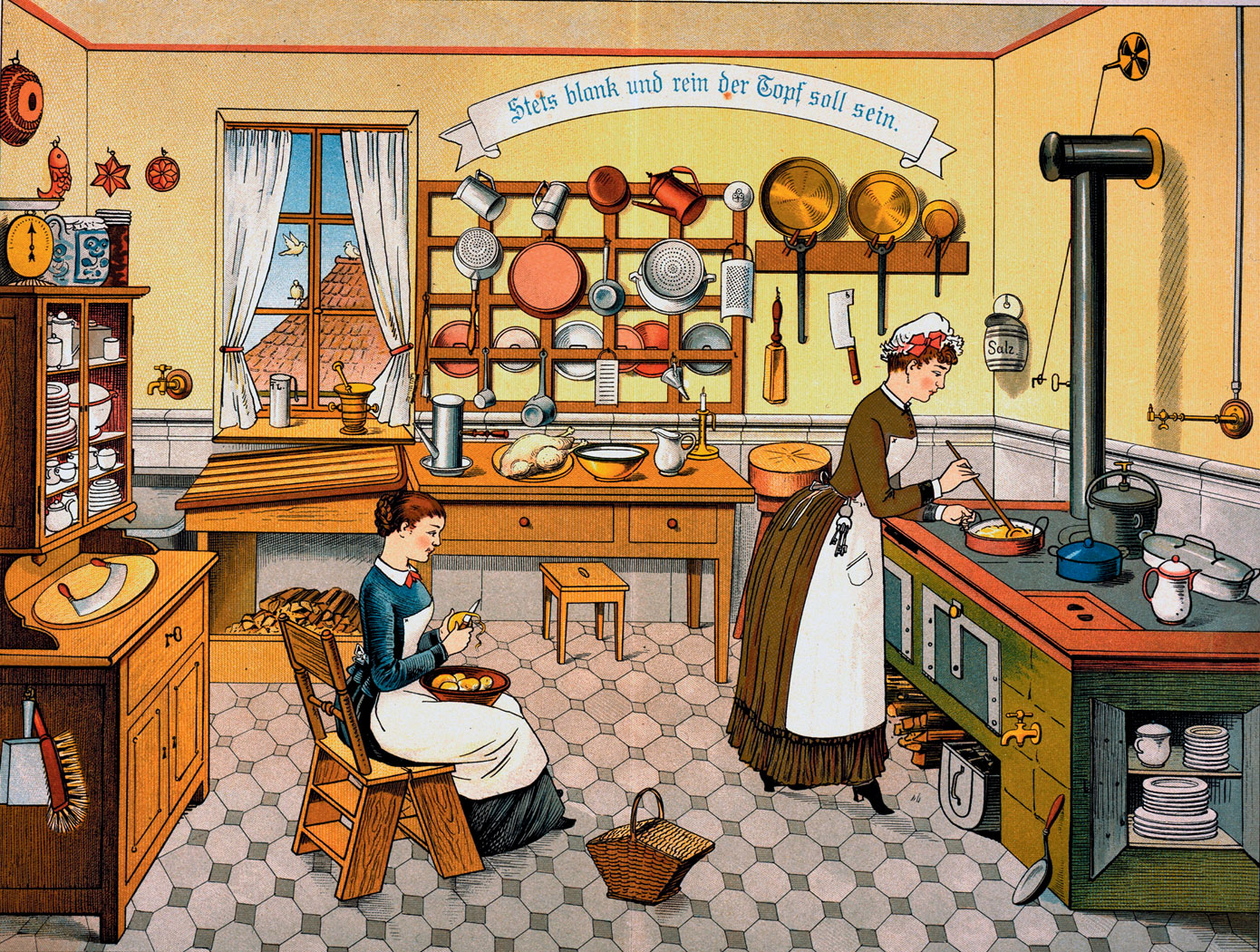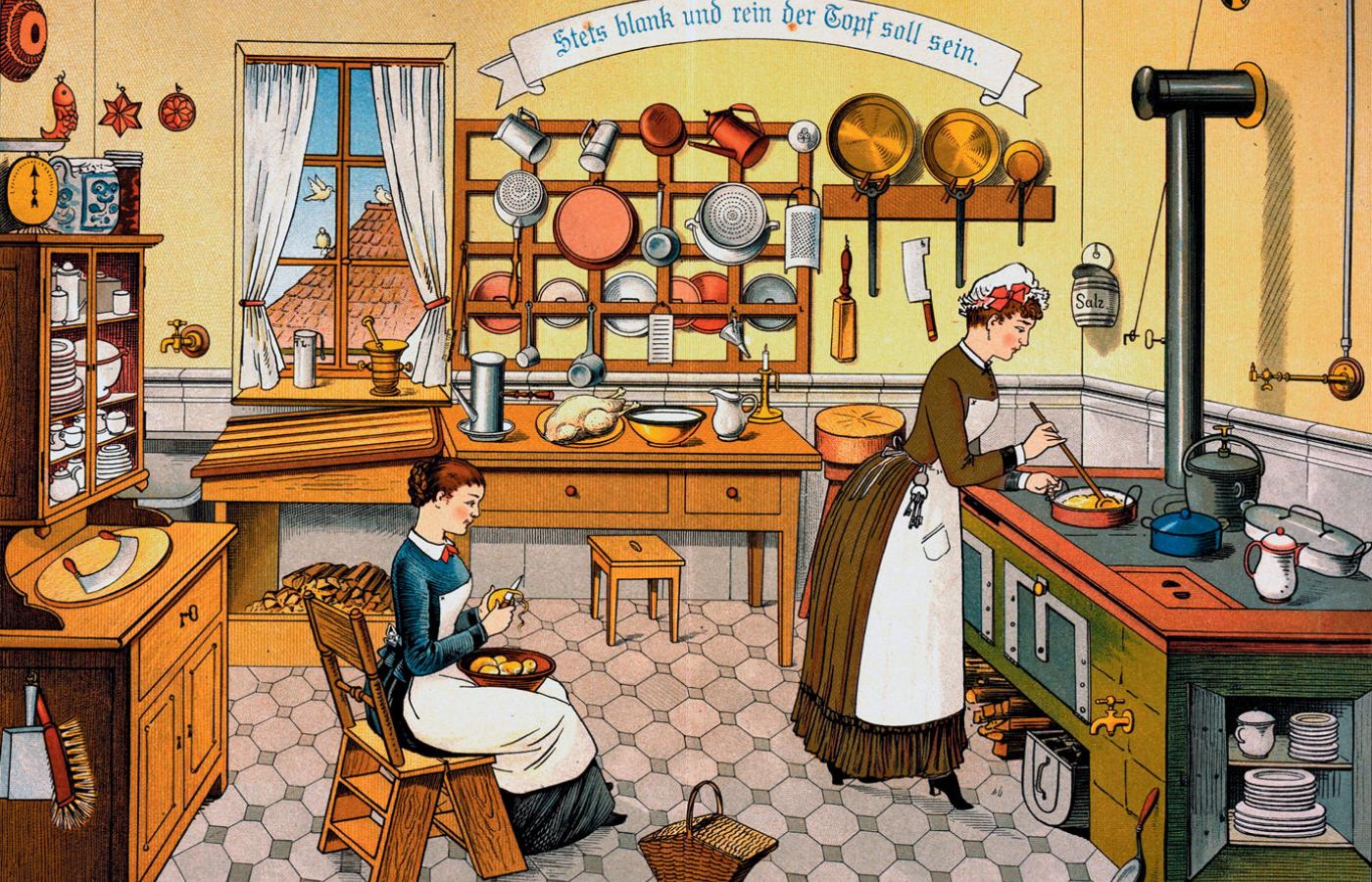 Dokładny czas oraz okoliczności powstania sloganu Kinder–Küche–Kirche (dzieci–kuchnia–kościół) wzbudzają zaciekłe spory wśród niemieckich badaczy. O ile nie ma pewności, czy ów stereotyp po raz pierwszy pojawił się już na początku XIX w., w czasach napoleońskich, to można śmiało stwierdzić, że rola kobiety jako matki i żony, a zarazem strażniczki cnót chrześcijańskich stała się oficjalnym programem elit politycznych utworzonego w 1870 r. cesarstwa. Konserwatywny światopogląd niemieckiego mieszczaństwa, będącego kulturową i polityczną podporą zjednoczonych Niemiec, propagował jasny podział ról społecznych, ograniczając rolę kobiet do sfery prywatnej.