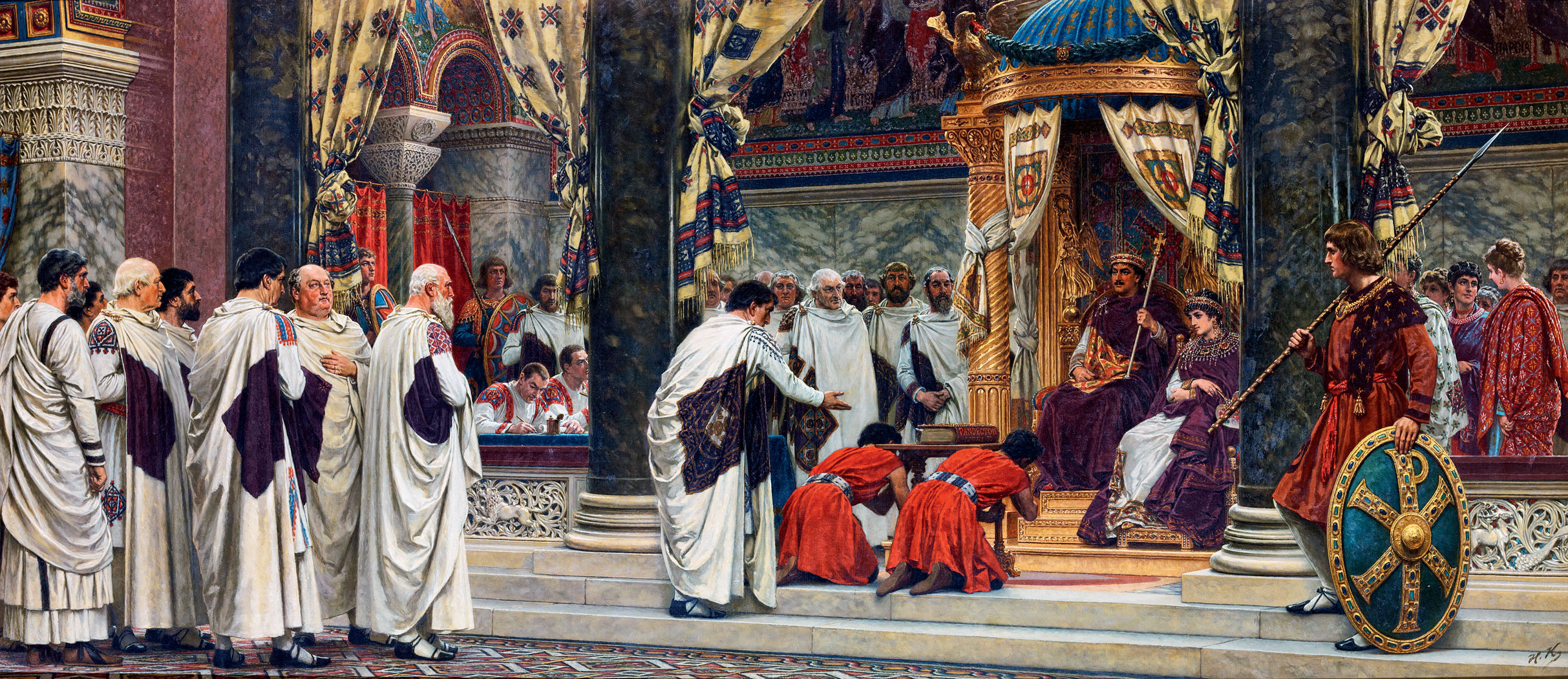 Najwyższym gremium zarządzającym państwem, działającym pod dyktando samego imperatora, była rada cesarska, nazywana konsylium albo konsystorzem. Przypominała współczesny rząd, składała się z wielu różnych dygnitarzy, najczęściej jednak zasiadali w niej czterej ministrowie. Dwaj zajmowali się finansami, przy czym jeden dbał o skarb państwowy (komes świętych rozdawnictw), a drugi o prywatne majątki cesarza (komes skarbu prywatnego); trzeci odpowiadał za dyplomację, zakłady zbrojeniowe, przyboczną gwardię cesarską oraz służby specjalne (magister oficjów); ostatni – za kształt konstytucji ogłaszanych przez cesarza (kwestor świętego pałacu). Poza ministrami, cesarza otaczały także bliskie osoby, często niepiastujące urzędów, ale o ogromnym wpływie, np.