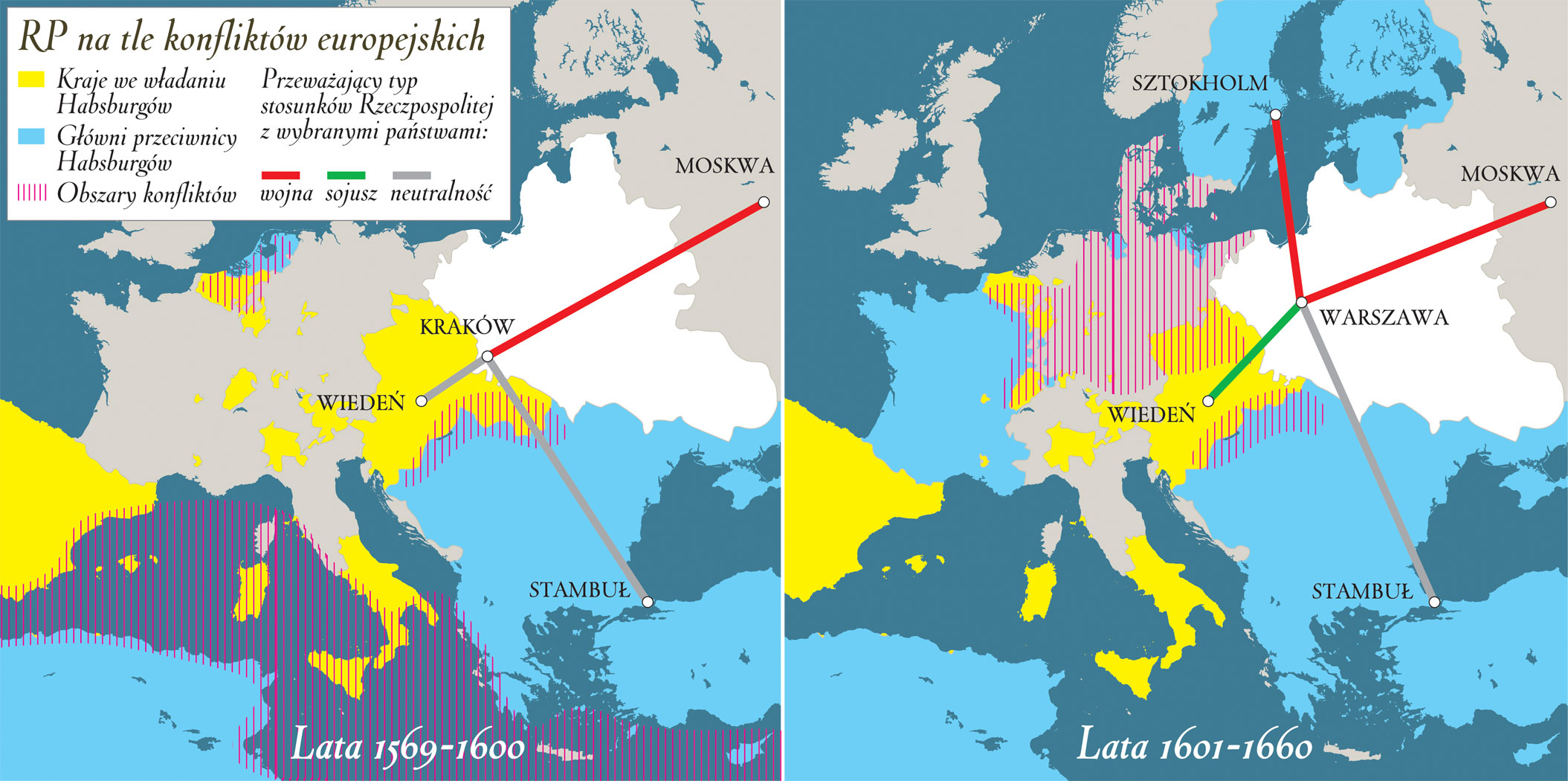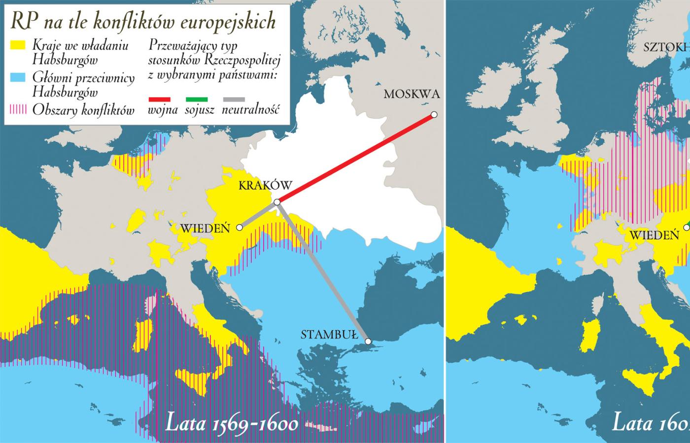 Kurs wyjściowy. W chwili swego powstania Rzeczpospolita Obojga Narodów funkcjonowała w dość klarownej przestrzeni geopolitycznej. Stosunki z Habsburgami, po utracie przez Jagiellonów tronów czeskiego i węgierskiego, były poprawne. Małżeństwa Zygmunta II Augusta z Habsburżankami, choć nieudane, stanowiły tego odzwierciedlenie. Młody książę pruski Albrecht Fryderyk Hohenzollern złożył w Lublinie hołd i jego ambicje co do pozycji w Rzeczpospolitej nie wydawały się dla niej zagrożeniem. Na zachodzie panował więc względny spokój.