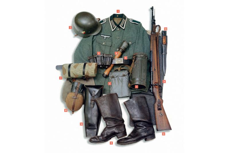 1. Kurtka wz. 1935, zapinana na 5 guzików i z 4 kieszeniami o charakterystycznym kroju – klapy w szpic, plisy. Srebrny galon wokół kołnierza z ciemnozielonego sukna – oznaka stopnia Unteroffizier (sierżant). 2. Hełm wz. 1935 pokryty matową farbą szaro-zieloną (feldgrau). Z prawej strony kalkomania w barwach narodowych, z lewej – godło Wojsk Lądowych (Heer): srebrny orzeł na czarnej tarczy. 3. Płachta namiotowa wz. 1931, o deseniu przepisowym dla Wojsk Lądowych. 4. Spodnie sukienne w kolorze szarym (steingrau). 5. Pas z czernionej skóry z klamrą z groszkowanego metalu. 6. Torebka ceratowa z narzutką przeciwiperytową. 7. Maska gazowa wz. 1938. 8. Granat trzonkowy wz. 1924. 9. Ładownice z czarnej groszkowanej skóry. 10. Manierka aluminiowa wz. 1931. 11. Saperki żołnierskie. 12. Karabin Mauser 98k, kal. 7,79 mm. 13. Bagnet wz. 84/98. 14. Nożyce do cięcia drutów kolczastych, w futerale.