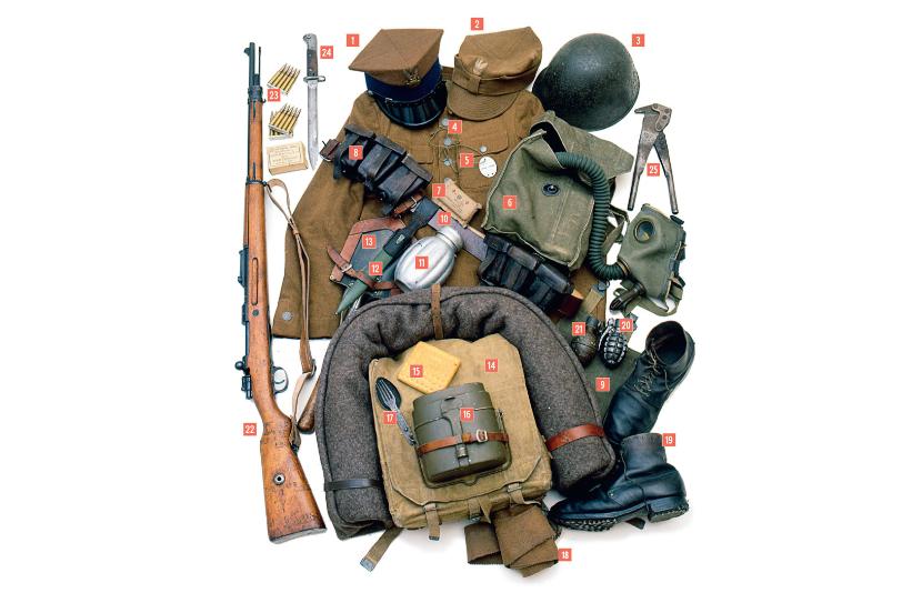 1. Rogatywka garnizonowa wz. 1936. 2. Rogatywka polowa wz. 1937. 3. Hełm polski wz. 1931. 4. Kurtka mundurowa wz. 1936. 5. Znak tożsamości. 6. Maska przeciwgazowa wz. 1932 w torbie brezentowej. 7. Opatrunek osobisty. 8. Para ładownic skórzanych na naboje karabinu Mauser wz. 1898a. 9. Chlebak wz. 1933. 10. Pas skórzany żołnierski. 11. Manierka wz. 1938. 12. Pochwa do bagnetu wz. 1929 z żabką. 13. Łopatka w pokrowcu skórzanym ramkowym. 14. Plecak wz. 1933 z kocem. 15. Suchar wojskowy z 1939 r. 16. Menażka wz. 1931. 17. Niezbędnik (łyżka i widelec). 18. Owijacze. 19. Para trzewików żołnierskich. 20. Granat obronny GR 1931. 21. Granat zaczepny GR 1931. 22. Karabin Mauser wz. 1898a prod. Fabryka Broni w Radomiu. 23. Amunicja łódkowana do karabinka Mauser wz. 1898a w pudełku fabrycznym. 24. Bagnet wz. 1929 na karabin Mauser wz. 1898a. 25. Nożyce do cięcia drutu.