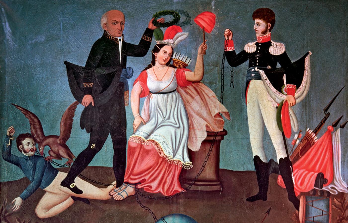 Libertador z Argentyny. San Martín rozpoczął karierę wojskową w armii hiszpańskiej jako nastolatek. W 1812 r. zaoferował swoje usługi juncie w Buenos Aires, stając po stronie niezależności kolonii. Jako zawodowy żołnierz nie miał zdolności politycznych Bolívara ani społecznego zaangażowania Morelosa, ale był zręcznym strategiem wojskowym. W 1817 r. udało mu się w bezprecedensowym rajdzie, przekraczając Andy, zaskoczyć siły rojalistów w Chile i zwyciężyć w bitwie pod Chacabuco. Kolejnym celem San Martina było Peru, stanowiące konserwatywny bastion hiszpańskiego imperium. Rojalistyczne nastawienie peruwiańskich Kreoli zmieniło się jednak, gdy Ferdynand VII uległ presji politycznej i nagle poparł liberalną konstytucję z 1812 r. W tej sytuacji cabildo w Limie zaprosiło San Martína do miasta, gdzie w 1821 r. ogłosił niepodległość Peru. Po kolejnych potyczkach z oddziałami rojalistów Argentyńczyk udał się do Ekwadoru na historyczne spotkanie z Simónem Bolívarem. Nie wiadomo dokładnie, o czym rozmawiali dwaj libertadorzy. Faktem jest, że po tym spotkaniu San Martín zrezygnował ze wszystkich stanowisk i wyjechał do Europy, gdzie zmarł w 1850 r.