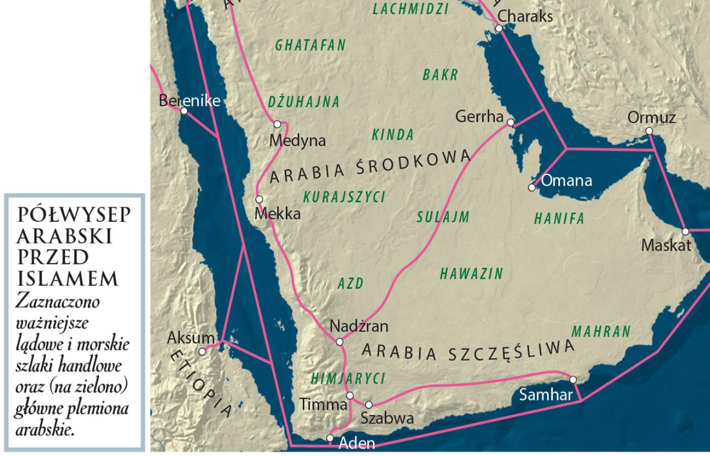 Półwysep Arabski jest nazywany przez jego mieszkańców Dżazirat al-Arab, Wyspą Arabów. Z trzech stron jest on oblany wodami mórz: Arabskiego od wschodu, Czerwonego od zachodu, Oceanu Indyjskiego od południa, zaś od północy od reszty świata oddziela go morze piasków: Pustynia Syryjska. I to pustynia w największym stopniu ukształtowała dzieje Arabów i sposób ich egzystencji, zmuszając do długiego trwania przy koczowniczym trybie życia, choć i w dawnych czasach istniały oazy i osiedla typu miejskiego, a jednym z czynników rozwoju społecznego była rywalizacja pomiędzy beduinami (beduin to nie nazwa etniczna, lecz arabski odpowiednik słowa koczownik) a ludnością osiadłą.