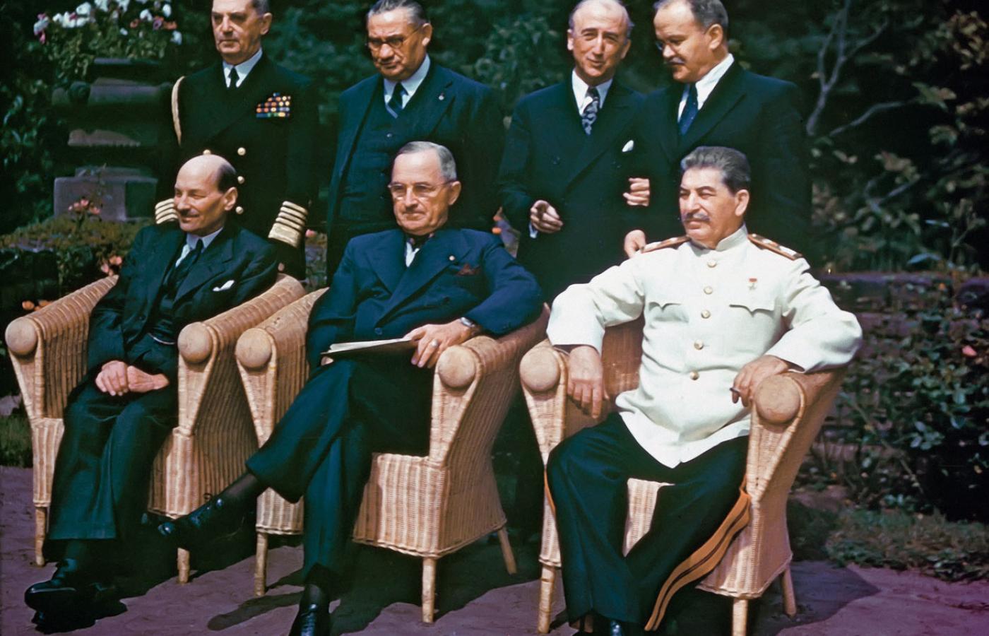 Zachodnia granica Polski. O dziesiątej czterdzieści w nocy z 1 na 2 sierpnia 1945 r. zebrała się w Poczdamie po raz ostatni Wielka Trójka: Truman, Attlee i Stalin. Konferencja Poczdamska zamykała główny rozdział wojny – europejski i rozpoczęła się 17 lipca. Przez pierwsze 9 dni Wielką Brytanię reprezentował Winston Churchill, ale 26 lipca poniósł klęskę w wyborach brytyjskich. (Co tłumaczono dwiema przyczynami: że dopuścił do upadku brytyjskiego imperium kolonialnego i tym, że brytyjska opinia publiczna, mocno zradykalizowana w czasie wojny, oczekiwała przemian społecznych, których dokonać miałaby Labour Party z Attleem na czele). Tak więc dokument poczdamski podpisał już nowy premier.