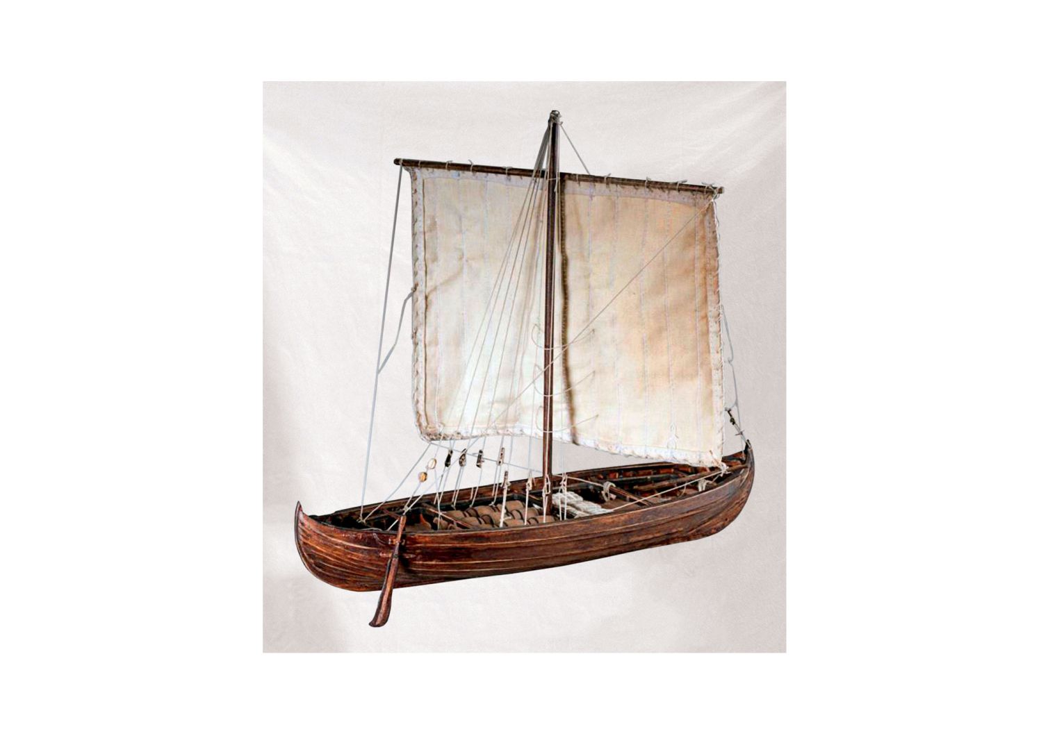 Knary. Klasyczne skandynawskie statki towarowe, knary, były mniej smukłe od okrętów wojennych, miały równie niewielkie zanurzenie, ale mocniejszą konstrukcję, dzięki czemu lepiej nadawały się do pływania po pełnym morzu (dł. 14–22 m, szer. 4–6 m, a stosunek długości do szerokości wynosił od 3:1 do 5:1). Osią konstrukcyjną szkieletu statku była stępka, do której przytwierdzano wykonane z pojedynczych kawałków drewna dziobnicę i stewę rufową. Kadłub o poszyciu zakładkowym był zrobiony z dartych wzdłuż pnia desek o długości równej długości całego statku. Do zrobienia takich desek nadawały się tylko proste, pozbawione sęków pnie, więc był to drogi materiał. Nachodzące na siebie deski poszycia przytwierdzano do kilu, dziobnicy i stewy rufowej gwoździami. Knary miały wyższe burty niż jednostki wojenne, ponieważ polegały głównie na napędzie żaglowym. Statki te były wyposażone w umieszczony na śródokręciu maszt z żaglem rejowym. Do sterowania jednostką służyło umieszczone na prawej burcie wiosło sterowe. Choć statki miały kilka stanowisk dla wioślarzy, wioseł używano głównie przy wchodzeniu i wychodzeniu z portu oraz przy zwrotach i zmianach kursu względem wiatru.