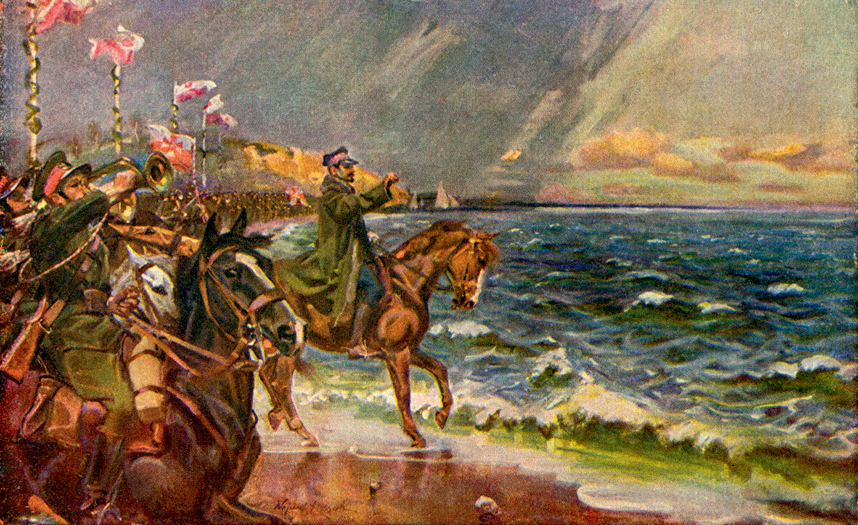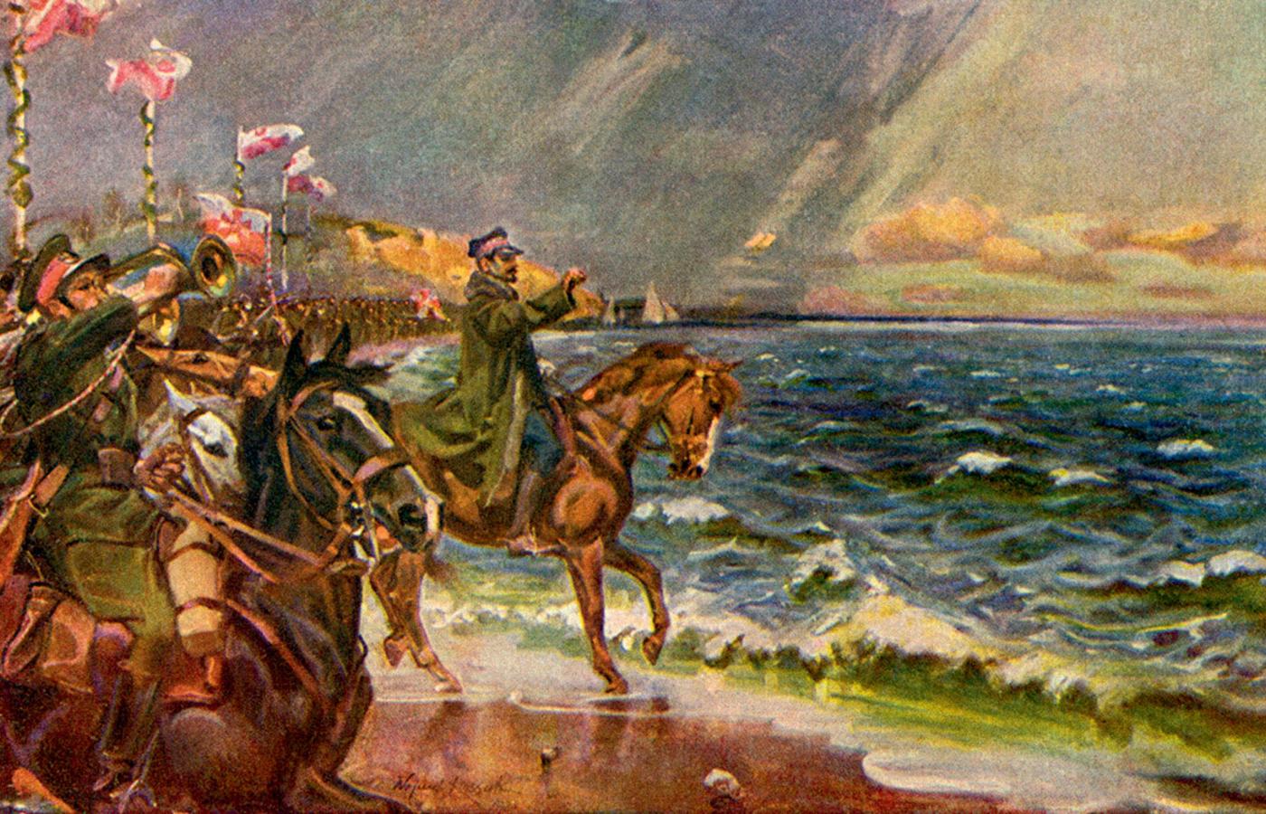 Pierwszy powrót. Ogłoszona 3 czerwca 1918 r. wspólna deklaracja państw Ententy mówiła, że ustanowienie „zjednoczonego i niepodległego państwa polskiego z dostępem do morza stanowi jeden z warunków trwałego i sprawiedliwego pokoju w Europie”. Na mocy kończącego Wielką Wojnę traktatu wersalskiego (1919 r.) Polska otrzymała liczący ok. 140 km odcinek wybrzeża, sięgający od Sopotu po Jezioro Żarnowieckie. Zaangażowanie w walki o granice odrodzonego państwa opóźniło faktyczne objęcie władzy na tym terenie. Dopiero w styczniu 1920 r. żołnierze Frontu Pomorskiego pod dowództwem gen. Józefa Hallera zajmowali miejscowość po miejscowości – bez większych incydentów. Moment zetknięcia polskiego wojska z Bałtykiem z rozmysłem zaplanowano jako manifestację o symbolicznym znaczeniu. 10 lutego 1920 r. Haller wysiadł z pociągu w Pucku, dosiadł konia i w towarzystwie szwadronu kawalerii ruszył w stronę portu. Tam, rzuciwszy pierścień w fale Bałtyku, dokonał historycznych zaślubin Polski z morzem.