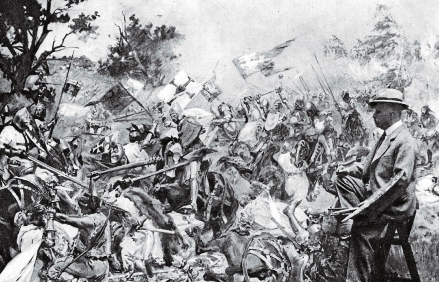 Krzyżacy zrazu nie musieli szukać argumentów dla poparcia swojej misji i samego istnienia państwa zakonnego w Prusach. Walki z niewiernymi, w tym wypadku z Litwinami, stanowiły naturalne zadanie zakonu rycerskiego. Jego ideologia opierała się na dorobku średniowiecznej filozofii, a zwłaszcza na recepcji myśli św. Augustyna. Usystematyzował on istniejące już nieco wcześniej pojęcia wojny sprawiedliwej i niesprawiedliwej, a poprzez wyraźne zarysowanie granic między społecznością chrześcijańską a światem pogańskim („miasto Boga – miasto ziemskie”) usprawiedliwiał walkę z innowiercami. Recepcja poglądów św. Augustyna oraz – rozwijającego jego myśli w opozycji do twierdzeń św. Tomasza z Akwinu – Dunsa Szkota stała się podstawą światopoglądu Zakonu Krzyżackiego, co znalazło swe odbicie w tworzonych przez jego członków kronikach, na czele z Kroniką Piotra z Dusburga (I poł. XIV w.).
