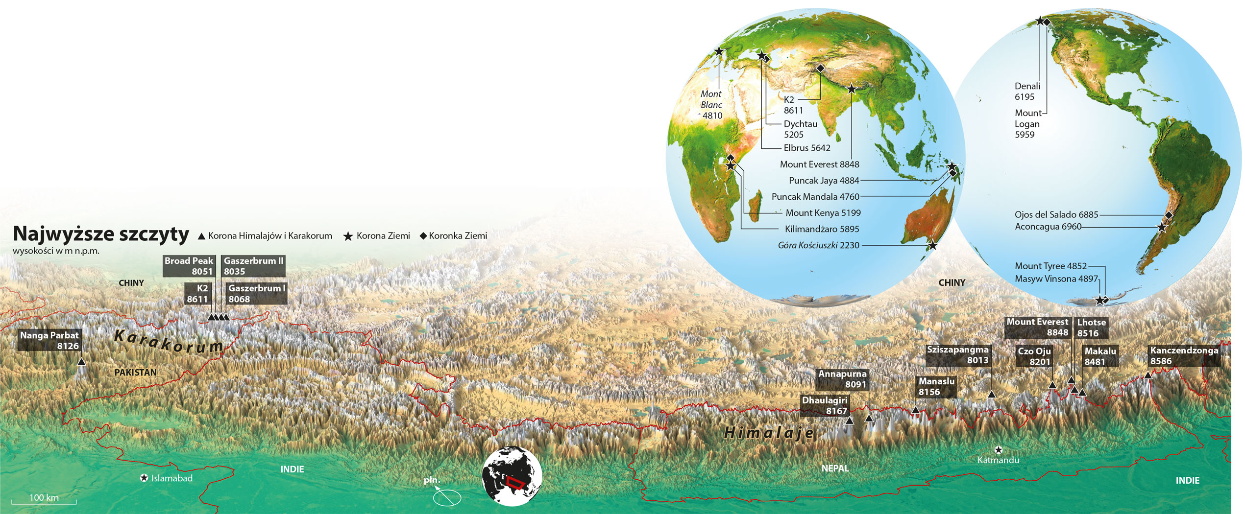 Na świecie jest 14 gór liczących więcej niż 8 tys. m (n.p.m.; wysokości gór są podawane w stosunku do poziomu morza, choć tego za każdym razem nie zaznaczamy). Wszystkie na terenie Himalajów oraz Karakorum. Są to (od najwyższej, patrz infografika): Mount Everest (Himalaje), K2 (Karakorum), Kanczendzonga (Himalaje), Lhotse (Himalaje), Makalu (Himalaje), Dhaulagiri (Himalaje), Manaslu (Himalaje), Cho Oju (Himalaje), Nanga Parbat (Himalaje), Annapurna (Himalaje), Gaszerbrum I (Karakorum), Broad Peak (Karakorum), Gaszerbrum II (Karakorum), Sziszapangma (Himalaje).