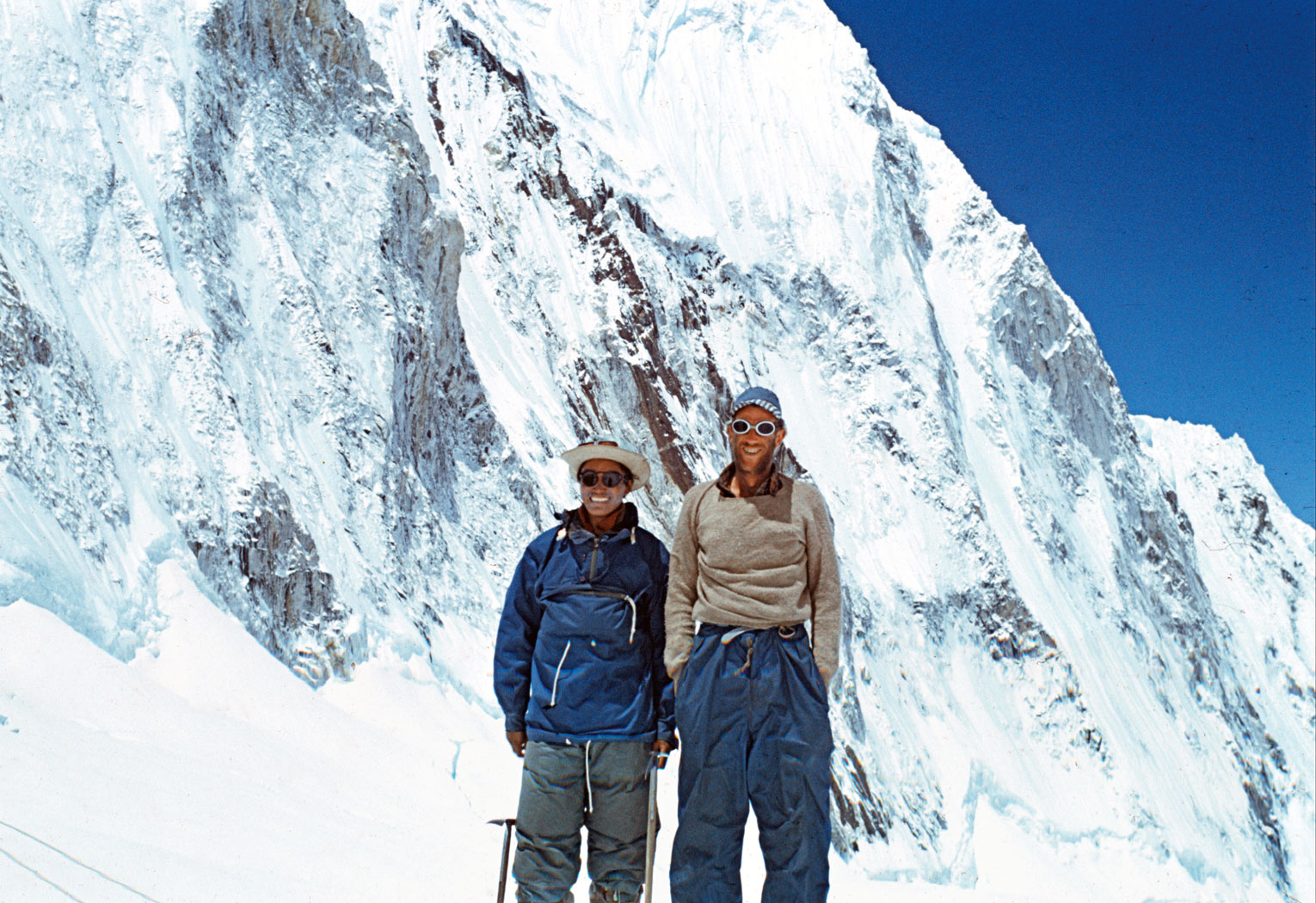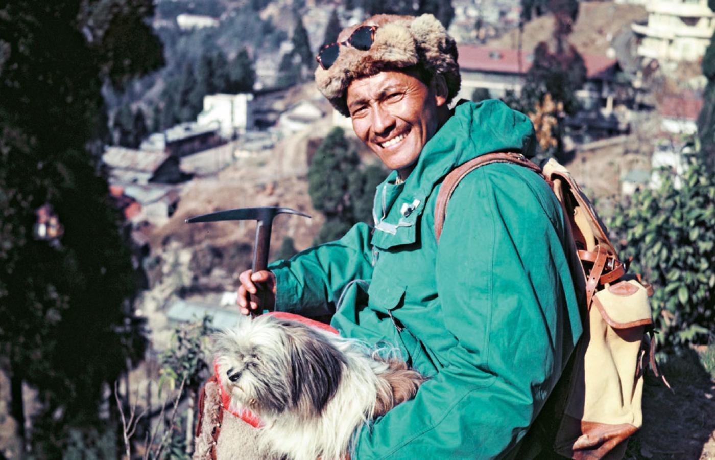 Hillary wydobył aparat i zrobił kilka zdjęć na kliszy Kodaka. Do historii przeszło jedyne udane, przedstawiające Tenzinga w kapturze, goglach, masce tlenowej, unoszącego czekan na znak zwycięstwa. Tenzing nie miał aparatu, selfie jeszcze nie wynaleziono, a Hillary nawet nie myślał o sfotografowaniu się na szczycie. W wygrzebanym w śniegu dołku umieścił za to na prośbę kierownika wyprawy Johna Hunta krzyżyk, który ten otrzymał od znajomego duchownego. Tenzing w swoim dołku umieścił garść cukierków, jako ofiarę dla bogów zamieszkujących według buddyjskich wierzeń szczyt góry, oraz ołówek swojej córki Nimy.