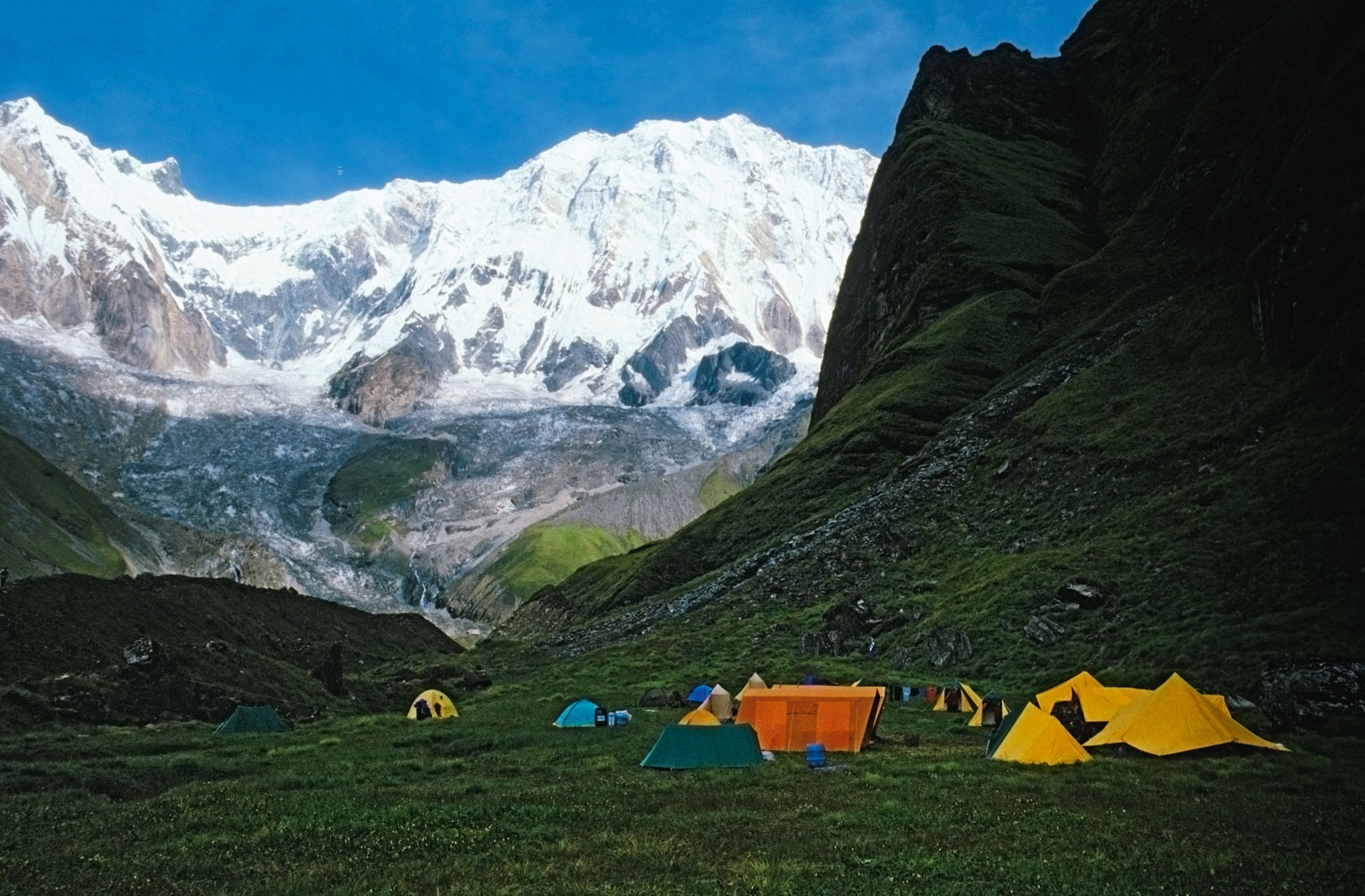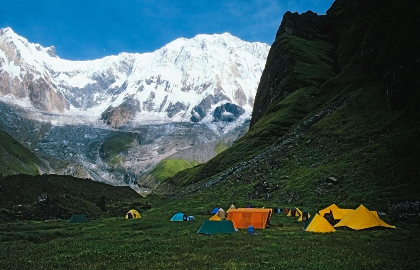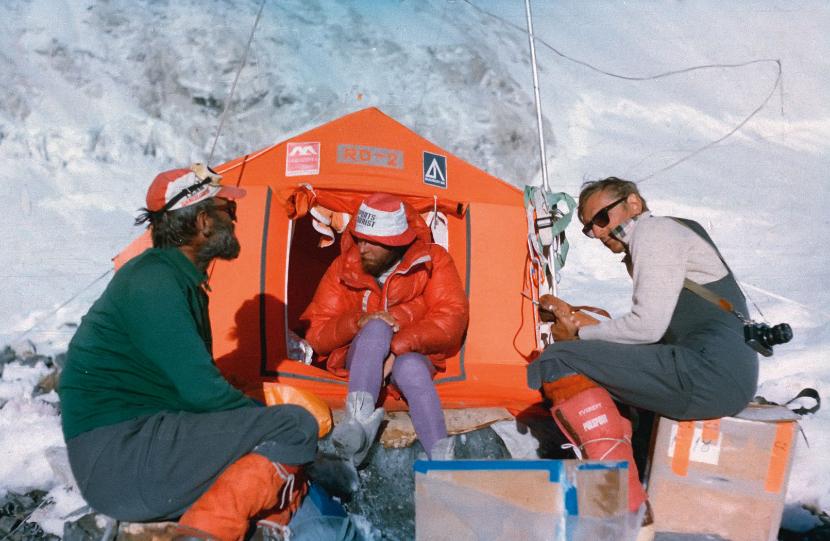 Miasto po horyzont. Mirosław Dąsal, zwany Falco, uczestnik wielu ważnych polskich wypraw, przybył do bazy u podnóży Everestu i swoje wrażenia zapisał w dzienniku pod datą 23 marca 1989 r.: „Już widać pierwsze namioty, to baza amerykańska – jak na Amerykę przystało małe miasteczko bez mała, kolorowe, gwarno, pośrodku wmurowany w lodowiec wysoki słup, z którego zwisają barwne chorągiewki w cztery strony świata. Dalej baza nowozelandzka, też z flagami i chorągwiami. A gdzie jest nasza? A, jest, stoi niczym ubogi krewny przy tamtych kilku namiotach i tyle”.